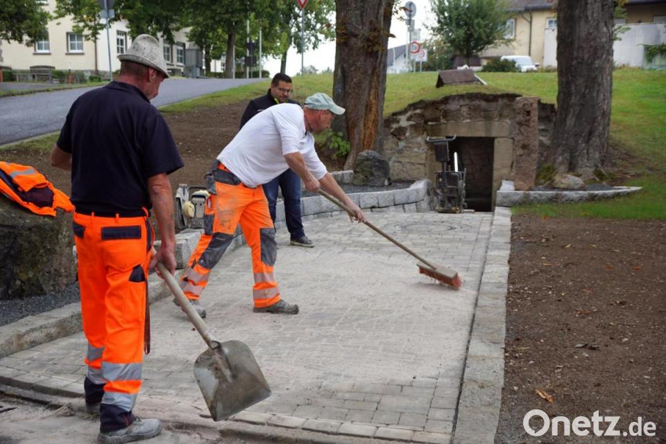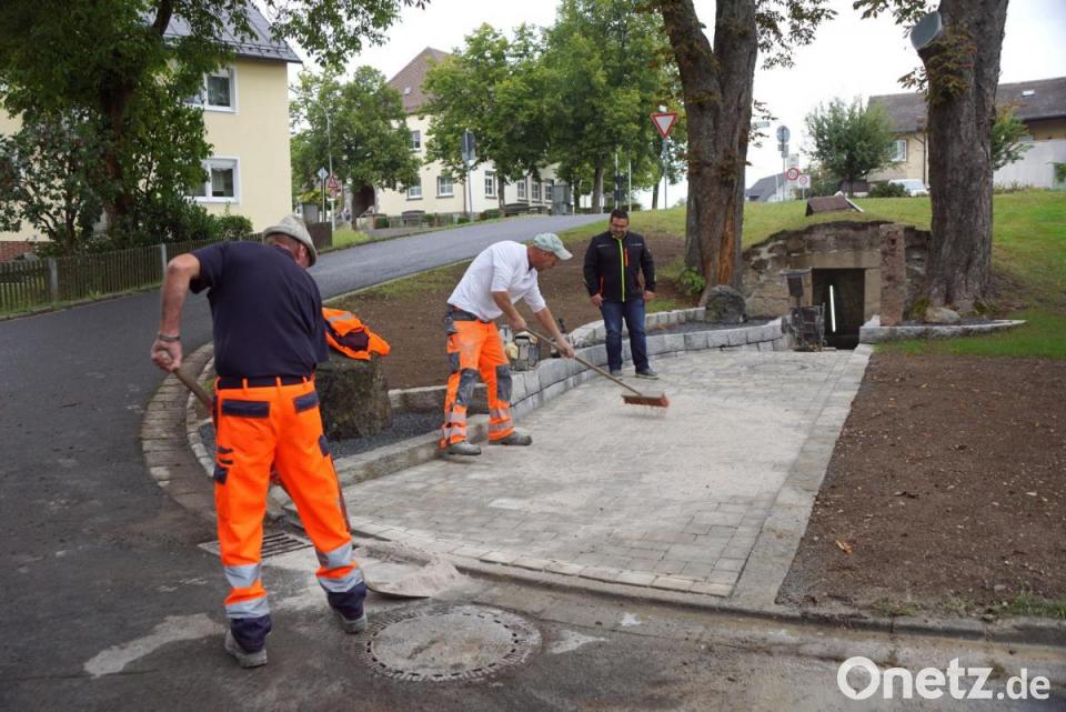 Kostenlos überließ Konrad Merkl seinen alten Felsenkeller am Mühlweg der Gemeinde. Der Gemeinderat beschloss daraufhin, den Keller als Kulturgut zu erhalten. Im Zuge der Dorferneuerung wurde er nun saniert und erhielt einen ansprechenden Zugang. Die letzten Arbeiten erledigte am Dienstag der Bauhof der Gemeinde. Leiter des Bauhofs Michael Wagner kehrte mit seinem Team den Quarzsand ein. Die Mitarbeiter der Gemeinde haben bis auf die Sandstrahlarbeiten im Kellergewölbe alle Arbeiten selbst ausgeführt. Die Materialkosten werden laut Bürgermeister Thomas Kaufmann über die Dorferneuerungsmaßnahme zu 90 Prozent getragen.