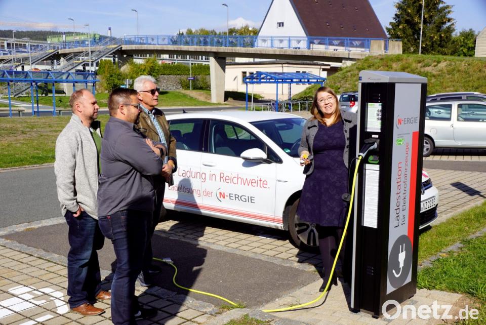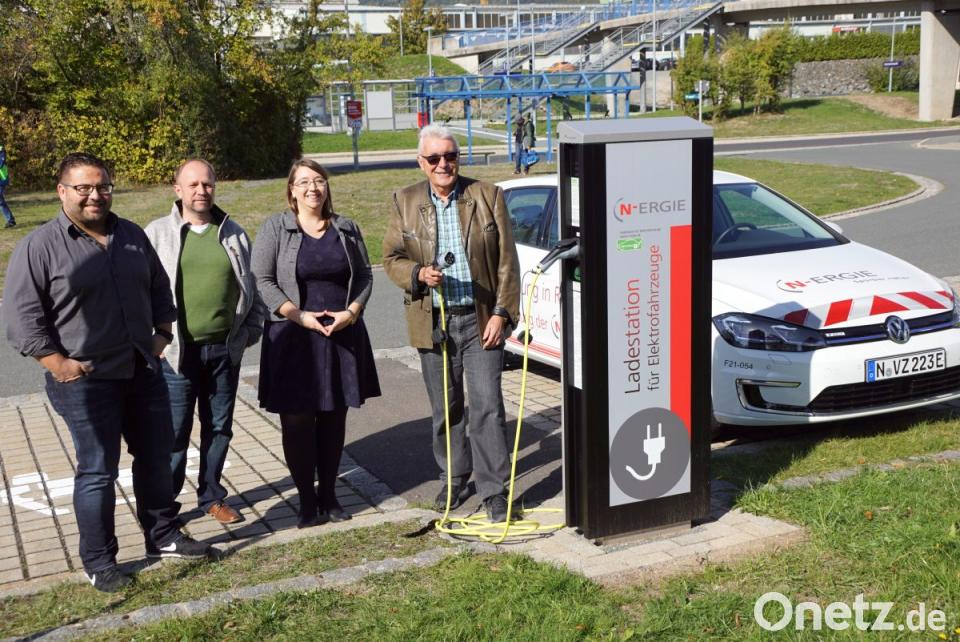 Auf dem Pendlerparkplatz beim neuen Bahnsteg können E-Autos ihre Batterien mit Ökostrom aufladen. Zweiter Bürgermeister Josef Hecht läutete mit Doreen Ibrahimovic von der Nürnberger N-Ergie Aktiengesellschaft das umweltfreundliche Fahren ein. Geschäftsstellenleiter Wolfgang Kilgert und Kämmerer Thomas Kaufmann ließen sich mit einweisen.