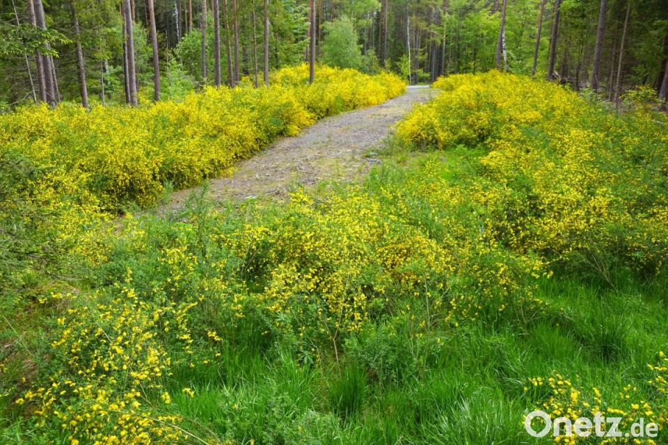 In ein gelbes Blumenmeer verzaubert blühender Ginster die Zufahrt und den Holzlagerplatzes im Forst an der Kreisstraße nach Göppmannsbühl. Vor drei Jahren durchwühlten Holzerntemaschinen bei einer großen Durchforstungsaktion den Wald. Kritik blieb nicht aus. Für Insekten entstand aber so auch ein kleines Paradies. Allerdings lässt Abfall vermuten, dass die so abgeschirmte Ecke für manches Schäferstündchen genutzt wird.