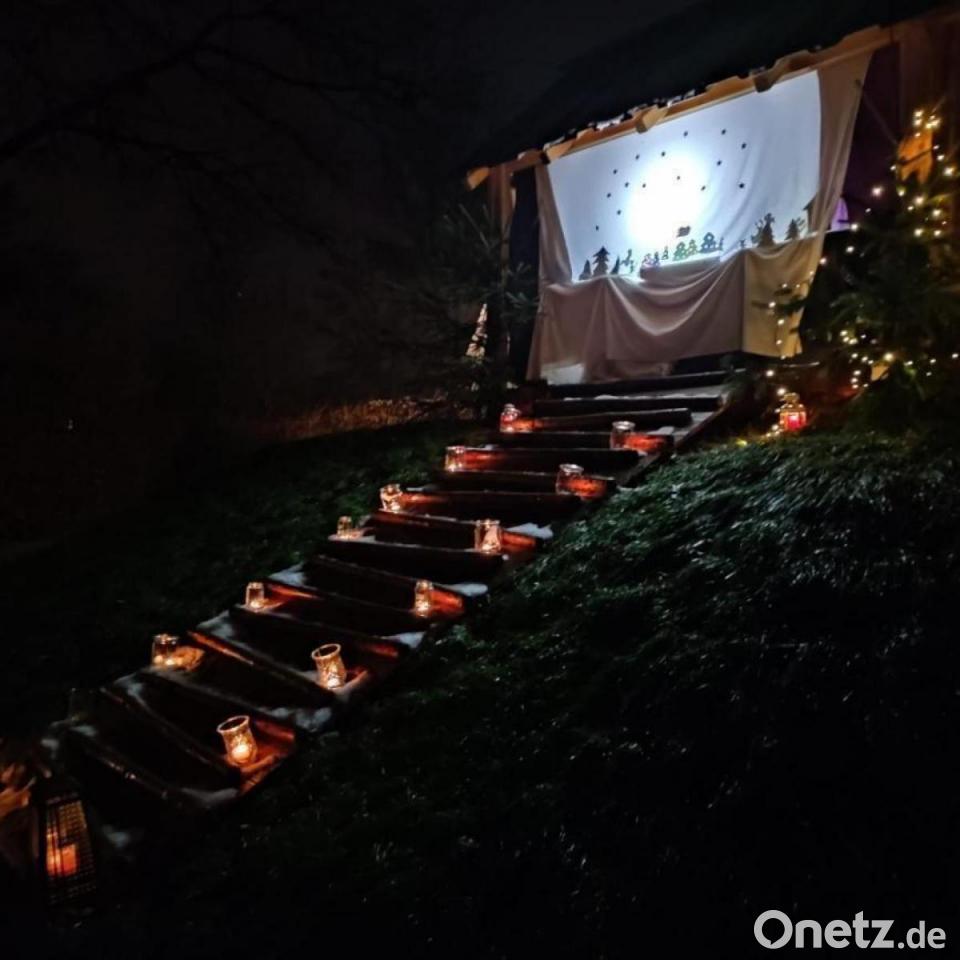 In der Dunkelheit am Abend waren alle Kinder und das Kindergartenpersonal begeistert von dem gelungenen Ambiente. Am Eingang des Krippengartens standen sie vor einem beleuchteten Adventstor. Ein mit Fackeln und Kerzenlichtern ausgeleuchteter Weg führte zum Veranstaltungsort. Leise ertönte dort weihnachtliche Musik. Das kleine Gartenhaus am Hügel hatte der Elternbeirat kurzerhand zum Schattenspiel-Theater gemacht.