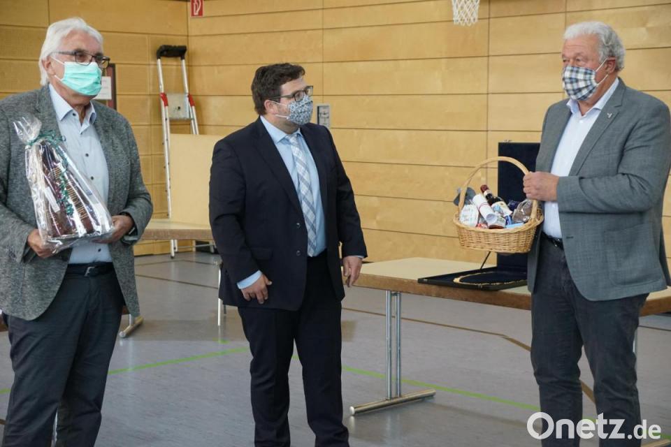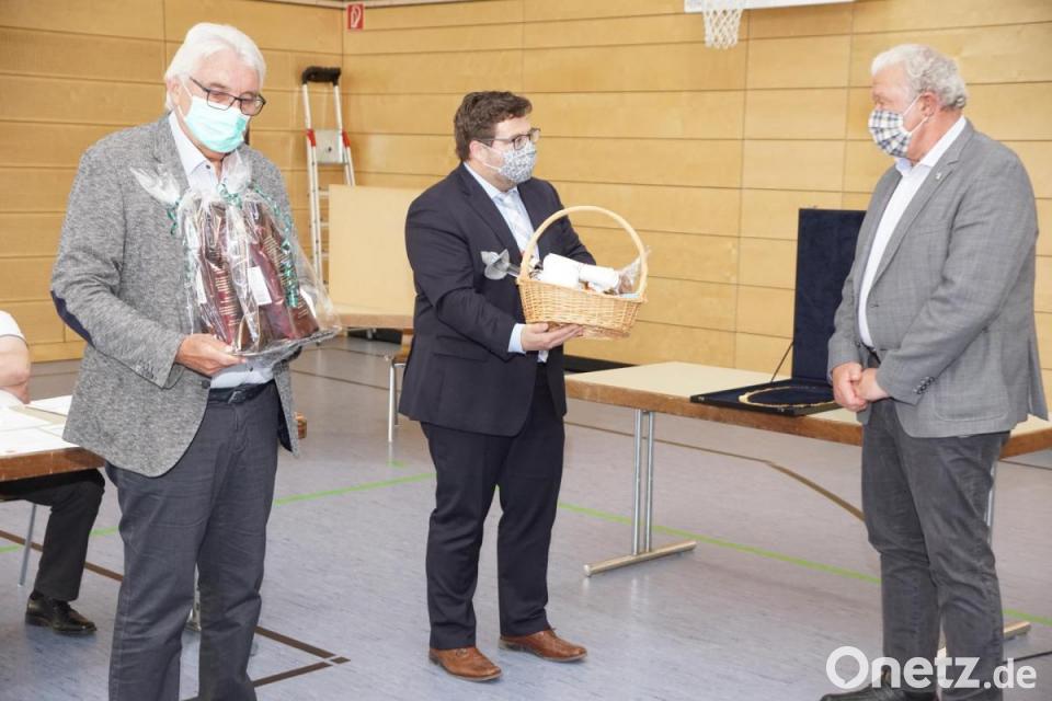 „Wir haben einen großen Umbruch“, betonte Kaufmann. Den neuen Gemeinderäten sprach er seinen Dank aus, für das Gemeinwohl einzutreten, und freute sich auf die künftige Zusammenarbeit. Kaufmann nutzte aber auch die Gelegenheit, Hecht Dank für seinen Einsatz in den zurückliegenden Monaten zu sagen. Es war nach seinen Worten eine Zeit, in der es viel aufzuarbeiten und zu kämpfen gab. Ein Umstand, der auch die kommenden Jahre noch prägen werde. In dieser schwierigen Zeit habe er sich als Geschäftsleiter auf den Zweiten und Dritten Bürgermeister, Josef Hecht und Eberhard Besold, verlassen können. „Ihr habt mir unheimlich unter die Arme gegriffen und geholfen, die Gemeinde wieder voranzubringen.“ Als Dankeschön hatte er für jeden einen Geschenkkorb mit in die Mehrzweckhalle mitgebracht.