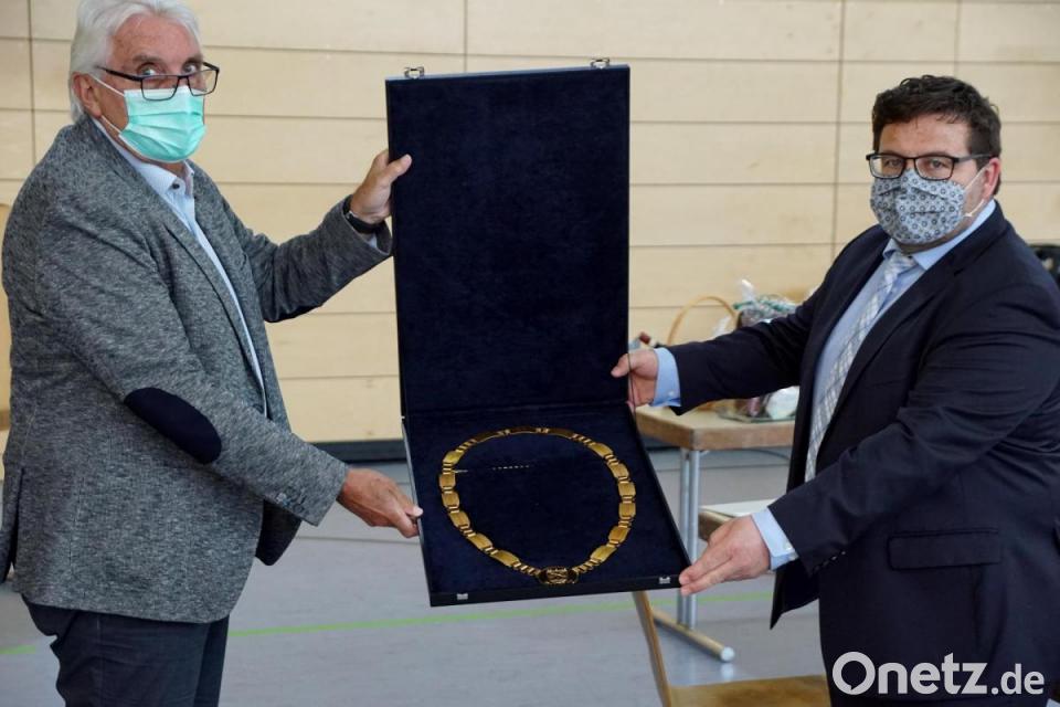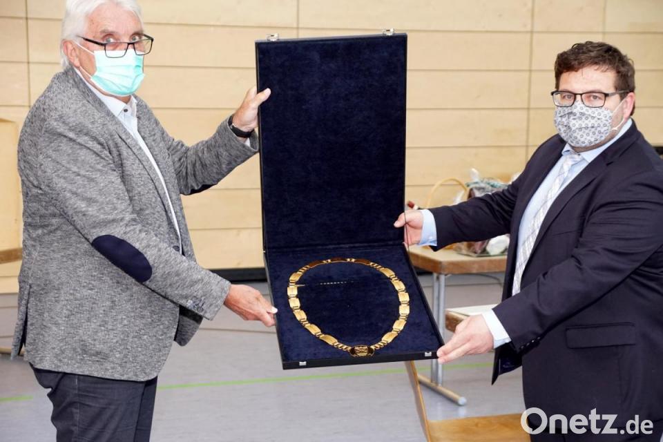 Die Amtskette des Bürgermeisters trägt nun der bisherige Geschäftsleiter und Kämmerer der Gemeinde Thomas Kaufmann. Er setzte sich bei der Stichwahl am 29. März mit 639 zu 522 Stimmen gegen Adrian Scheitler von der IWG durch. Josef Hecht, der als Zweiter Bürgermeister fast drei Jahre als amtierender Rathauschef die Geschicke der Gemeinde leitete, überreichte Kaufmann in der ersten Sitzung des neu gewählten Gemeinderates am Donnerstag die Amtsinsignie. Josef Hecht trug die von Gabriele Sieber gestiftete Kette aus verständlichen Gründen nicht, wie er bei der Übergabe betonte. Als Grund ließ er erkennen, dass ihm dies als stellvertretendes Gemeindeoberhaupt nicht zugestanden sei.