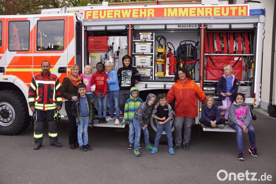 Kirwa feierte auch die Offene Ganztagsschule. Mit Handwagen und Musik zogen die Kinder zwar nicht durch das Dorf, sondern zum Feuerwehrgerätehaus. Heilerziehungspflegerin Claudia Schleicher und Nadine Manhart von der gfi Weiden hatten eine muntere Bande mitgebracht. Zweiter Kommandant Christopher Hörl nahm sich viel Zeit, die Aufgaben der Feuerwehr und deren Ausrüstung zu erklären. Mit Feuerlöschen alleine sei es heute nicht mehr getan, erfuhren die kleinen Besucher. Technische Hilfeleistungen sei zwischenzeitlich großgeschrieben. Die Brandschützer besäßen auch Spezialwerkzeug zum Öffnen von Türen, um zum Beispiel Sanitätern den Zutritt zu Wohnungen frei zu machen. Nach der Geräteschau und dem Blick ins Gerätehaus war aber Kirwa im Gemeinschaftsraum angesagt. Dazu hatten die Erzieherinnen Küchln mitgebracht. Den Apfelsaft hatte die Offene Ganztagsschule in der Kelterei des Obst- und Gartenbauvereins selbst gepresst.