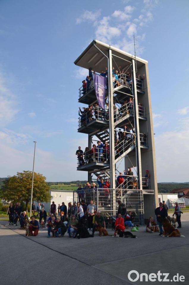Die Hundeschule Immenreuth nutzte das herrliche Herbstwetter zu einer Übungsstunde der besonderen Art. Diesmal war nicht das Übungsgelände zwischen Immenreuth und Lenau Dreh- und Angelpunkt der Hundeausbildung, sondern der Stützpunkt der Feuerwehr Weidenberg. Dort befindet sich ein Ausbildungsturm, an dem normalerweise Abseilen, Höhen- und Selbstrettung, Drehleitereinsatz und ähnliche Rettungszenarien geübt werden. Die Schützlinge von Hundeführerlehrer Peter Popp und seinem Team von der Hundeschule Immenreuth nahmen sich Zeit, sich mit dem Thema "Höhen- und Freitreppengewöhnung" zu beschäftigen. Der rund 18 Meter hohe und offene Übungsturm aus Stahl bot die ideale Gelegenheit, die Vierbeiner an Höhe, offene Trittstufen aus durchsichtigen Gitterrosten und den freien Blick nach unten und draußen zu gewöhnen. Angesichts von 100 Teilnehmern aus dem gesamten Einzugsgebiet von Nabburg, Waldsassen bis Kulmbach und Höchstädt bot sich die Möglichkeit, Gehorsam und Leinenführigkeit in größeren Menschen- und Tieransammlungen zu üben.
