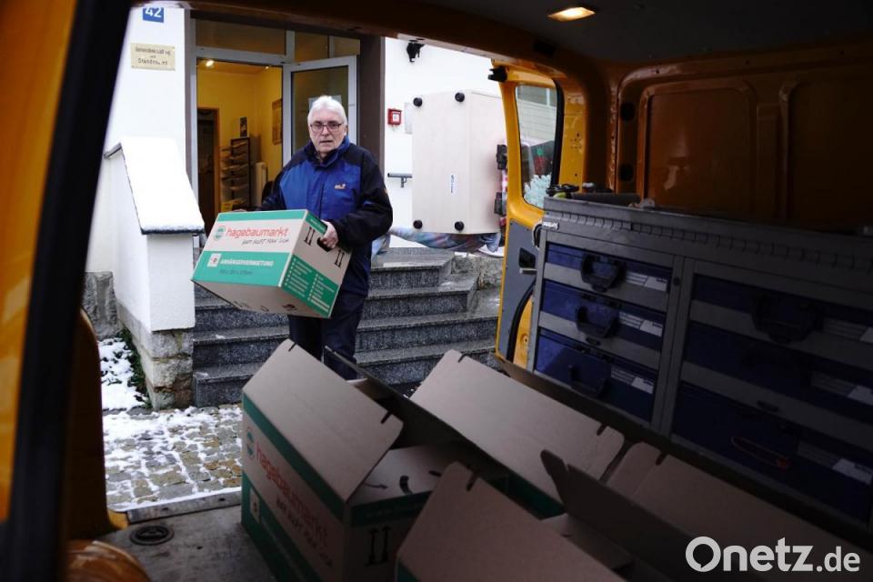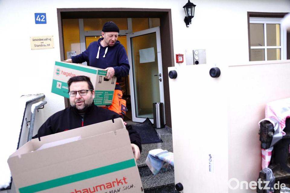 Brandschutz und Schimmelbefall des Rathauses machten den Umzug erforderlich. Alle Hände voll zu tun haben deshalb die Bauhofmitarbeiter und das Personal. Selbst Zweiter Bürgermeister Josef Hecht und Geschäftsleiter Thomas Kaufmann packen mit an und schleppen Kartons.