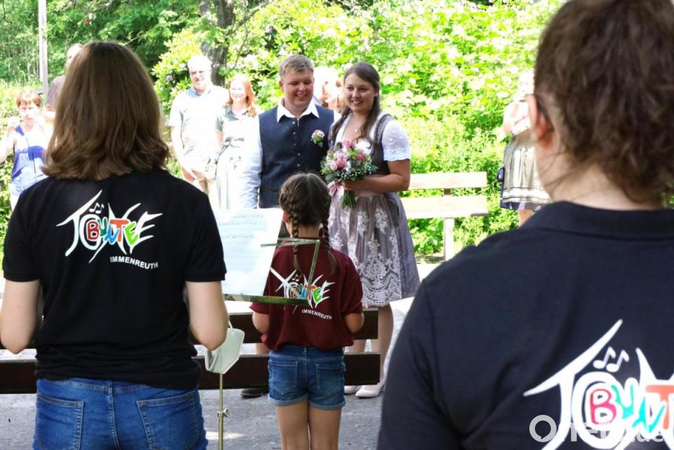 Im Schatten eines großen Laubbaums wartete der Kinder-und Jugendchor "Bunte Töne" unter Leitung von Katharina Hößl. Ihm gehört die Braut seit der Gründung an. Besonders an sie gerichtet war ihr erstes Lied "Weilst a Herz hast ...". Einen weiteren Glückwunsch nahm das Paar von der Jugendfeuerwehr Ahornberg entgegen. Andreas Schlicht überbrachte ihn für den zahlreich vertretenen Nachwuchs. Er erinnerte, dass Annemarie Zaus vor elf Jahren in die Jugendfeuerwehr eingetreten und zurzeit als Jugendwartin aktiv sei.