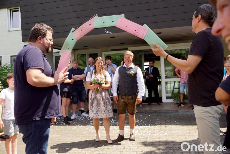 Die 25-jährigen Annemarie Zaus und Thomas Brunner gaben sich im Trauungszimmer der Familienferienstätte das Jawort vor Bürgermeister Thomas Kaufmann. Für das Gemeindeoberhaupt war es zudem die erste Eheschließung in seiner Amtszeit. Auf die Regierungsinspektorin bei der Regierung von Oberfranken und den Zimmerer bei Zimmermeister Bernd Schönfelder in Schadersberg warteten viele Gratulanten. Den Reigen eröffnete vor dem Eingang der Familienferienstätte das Sachgebiet 34 (Bauamt der oberfränkischen Regierung). 14 Kollegen waren dazu in die Oberpfalz gereist und hatten das Bild einer Gebäudefassade, die aus Geldscheinen gestaltet war, mitgebracht. Sie spielten damit auf den begonnenen Hausbau des Paares in Plößberg an. Vor der Übergabe musste noch ein Glücksbogen aus zusammengehefteten Umlaufmappen durchschritten werden.