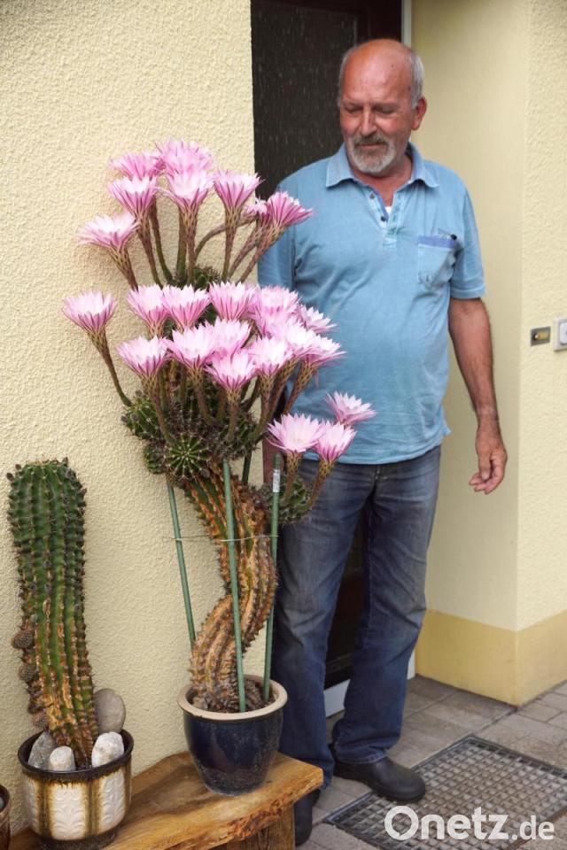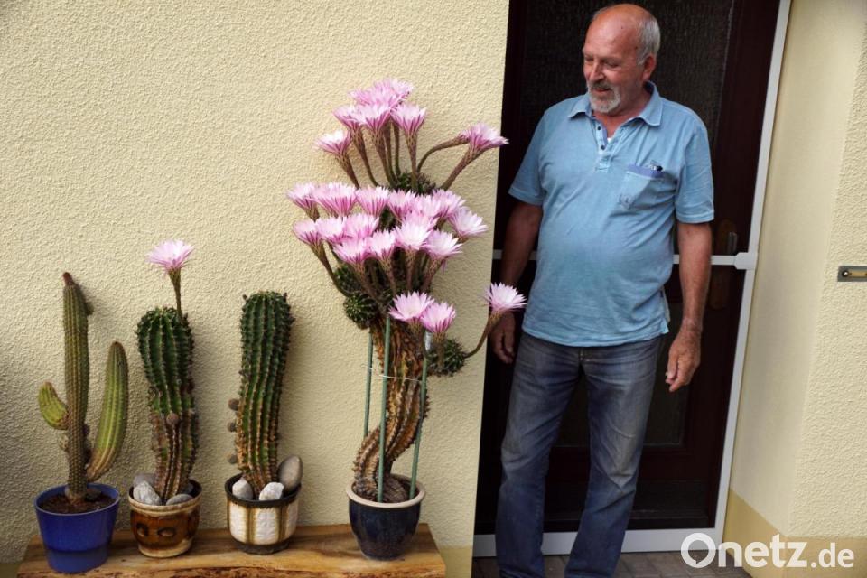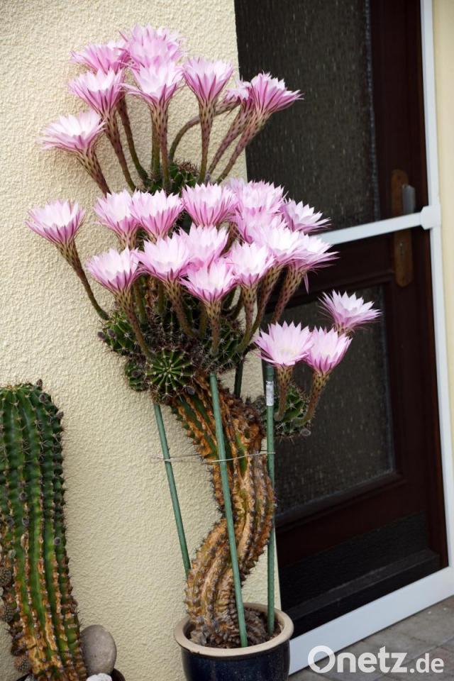 Kakteen haben einen guten Platz bei Karl Kreuzer in der Tiefenlohe. Über 30 Jahre zählt die stachelige Pflanze neben ihm und ist so groß wie er. 33 Blüten entfalteten dieser Tage ihre Pracht. Daneben andere Vertreter ihrer Art mit Blütenknospen. Den Weg ins Freie allerdings findet sein zwei Meter hoher, stechender Freund nicht mehr. Im Winter genießt er bei kühlen Temperaturen und wenig Wasser mit allen anderen Vertretern der Gattung seine Ruhezeit.