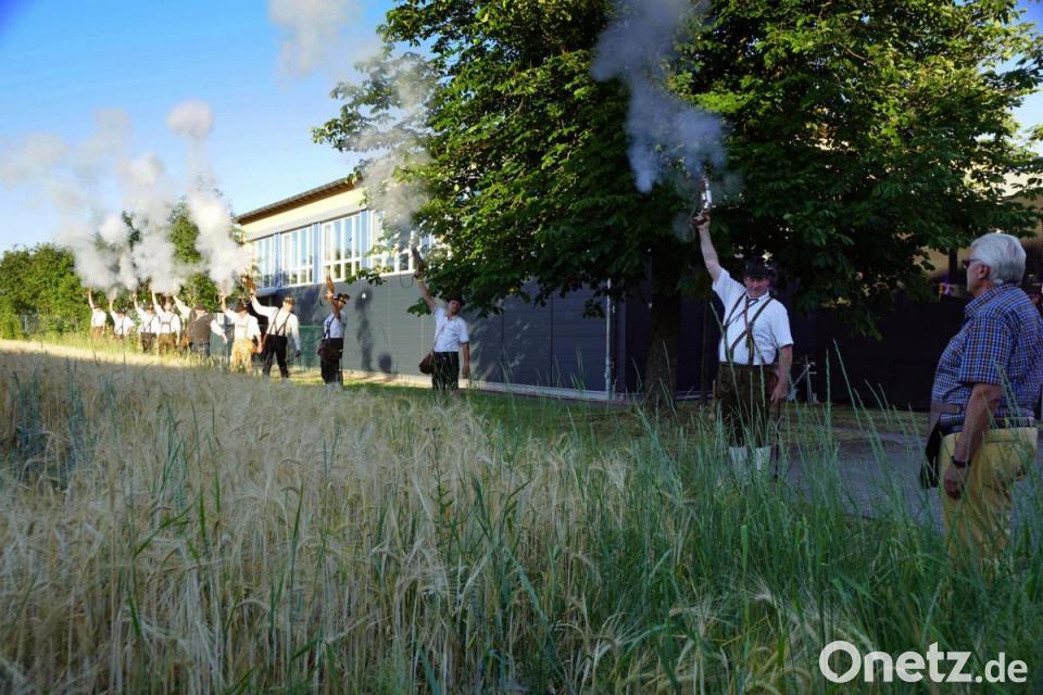Kein Wölkchen am Himmel und bei zunehmender Dunkelheit funkelten die Sterne am Firmament. Offiziell eröffneten die Böllerschützen das Begegnungsfest für die Bürger aus der Gemeinde und Umgebung. Zweiter Bürgermeister Josef Hecht schaffte es zwar nicht auf Anhieb, das Bierfass anzustechen, um mit seinem Stellvertreter Eberhard Besold auf das Wohl aller anzustoßen. Der Verlust an Gerstensaft hielt sich aber in Grenzen und hinterließ einen Fleck, der schnell wieder trocknete.