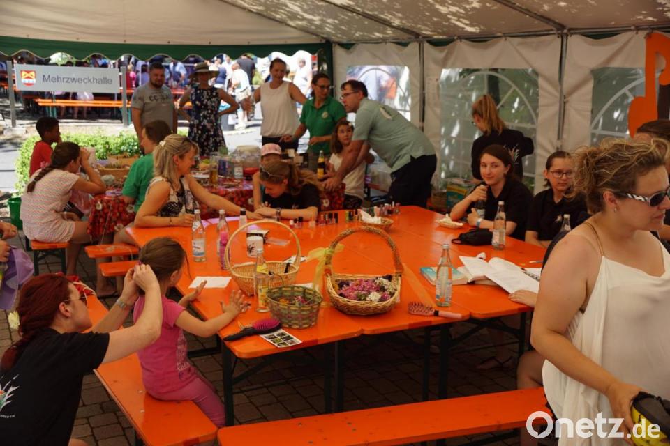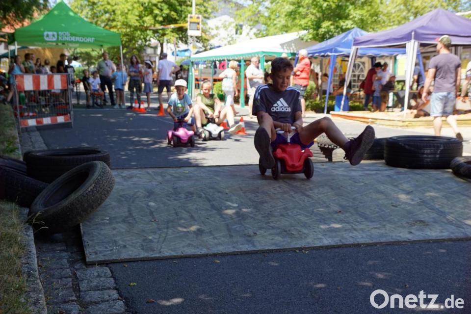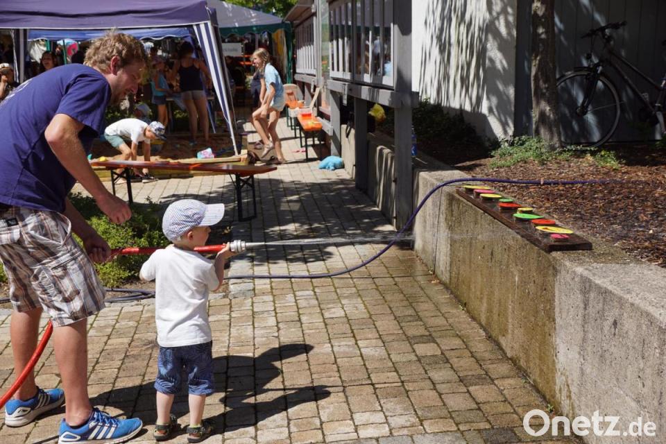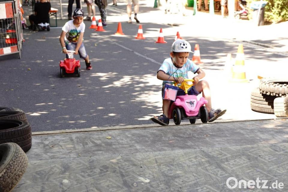 Der zweite Tag des Bürgerfestes (wir berichteten) gehörte besonders den Kindern. Ihnen hatten die Vereine eine großartige Spielstraße aufgebaut. Einmal wieder mit dem Bobby Car um die Wette über und durch Hindernisse fahren, große Seifenblasen machen, malen, schminken, Frisuren gestalten, basteln, in der Hüpfburg springen, im großen Sandkasten spielen oder beim Schaubacken dabei zu sein, garantierten Kurzweil. Begehrt waren die Löschwassereinsätze bei der Jugendfeuerwehr oder der Eiswagen.