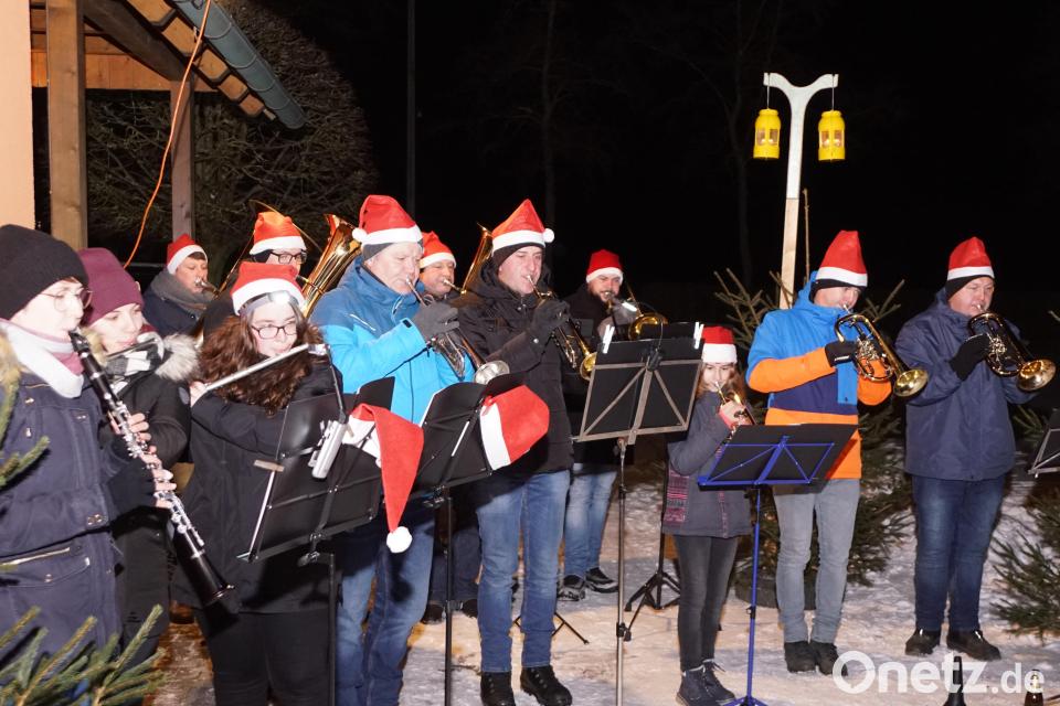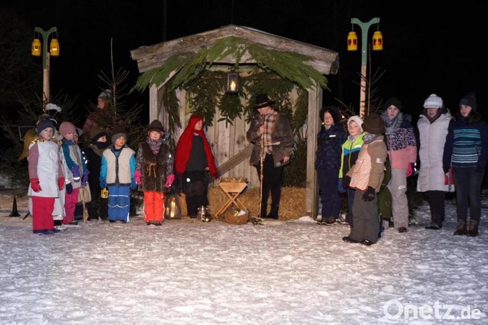 12 Bläser, 16 Kinder und die ganze Dorfgemeinschaft von Ahornberg kamen am Sonntag zur Weihnachtsfeier beim Feuerwehrgerätehaus zusammen. Dunkelheit, winterliche Temperaturen und glitzernder Schnee schafften eine besinnliche Atmosphäre für das Krippenspiel der Mädchen und Buben sowie den Besuch des Nikolaus.