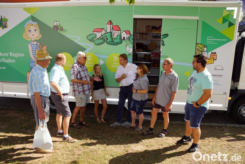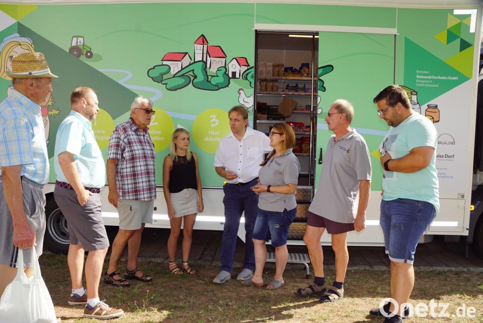 Im Mai begannen ihre Planungen, und die erste Fahrt des Dorfladens war die willkommene Gelegenheit Erfahrungen zu sammeln. In einem intensiven Gespräch mit Anja Zölch, der kaufmännischen Angestellten der Steinwald-Allianz, und dem Fahrer des Trucks, Karl-Heinz Meier, informierten sie sich und Kreuzer über das Angebot des mobilen Dorfladens, Versorgung auf Bestellung, Lieferwege und Bestellung wie im Online-Shop.