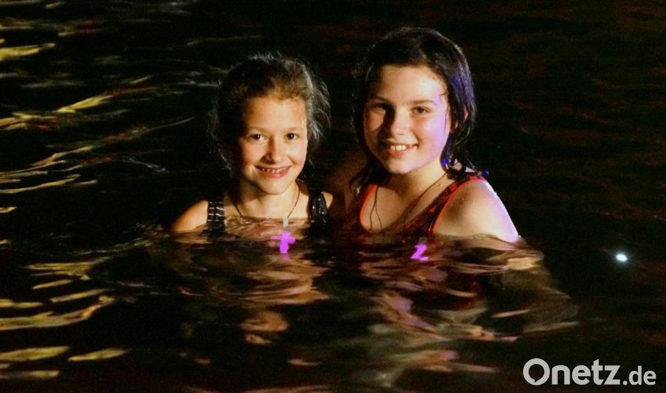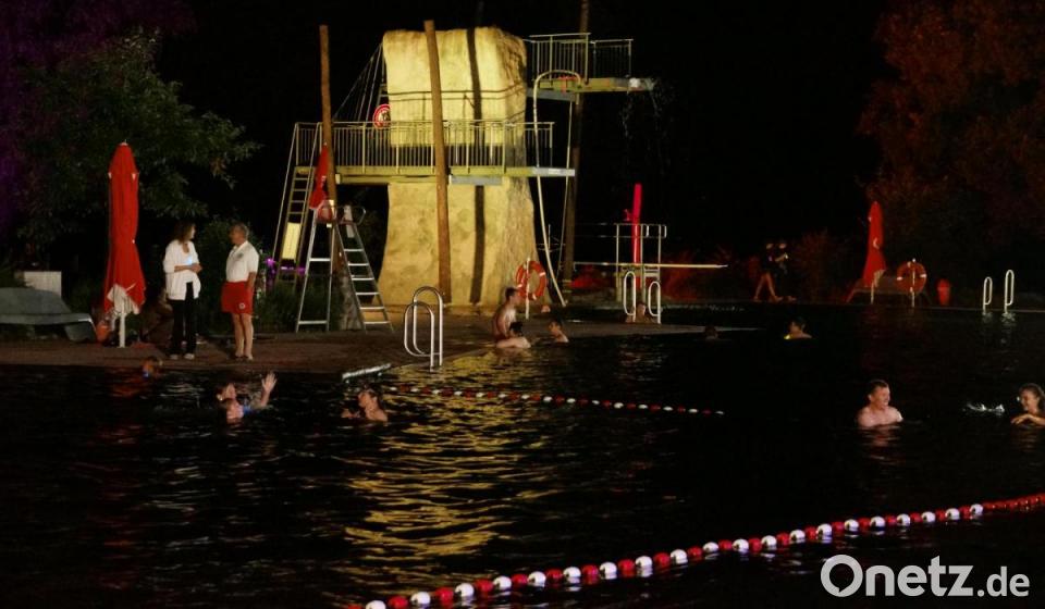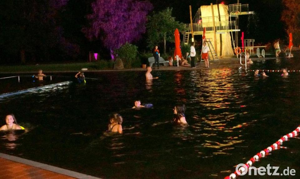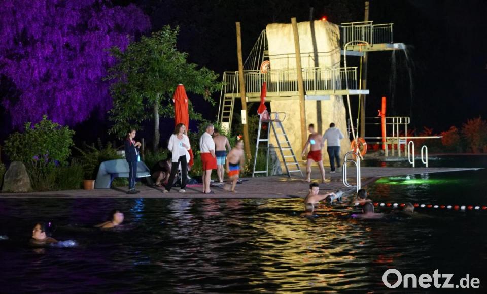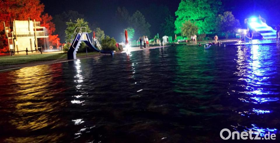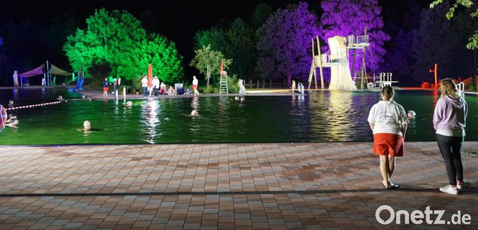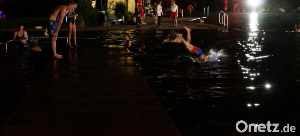Der Mond gab dem nächtlichen Badespaß von Samstag auf Sonntag im Naturerlebnisbad im Kemnather Land seinen Namen. Doch sehen ließ er sich während des dreistündigen Vergnügens nicht. Dem Gaudium rund um das Becken tat dies keinen Abbruch. In dezenten bunten Farben gehüllt waren die Bäume rund um das große Schwimmbecken. Das Fünf-Meter-Brett des Sprungturms verwandelte sich in einen Wasserfall. Musik vom Diskjockey und Warmes vom Grillwagen bescherten den Besuchern ein angenehmes Ambiente.