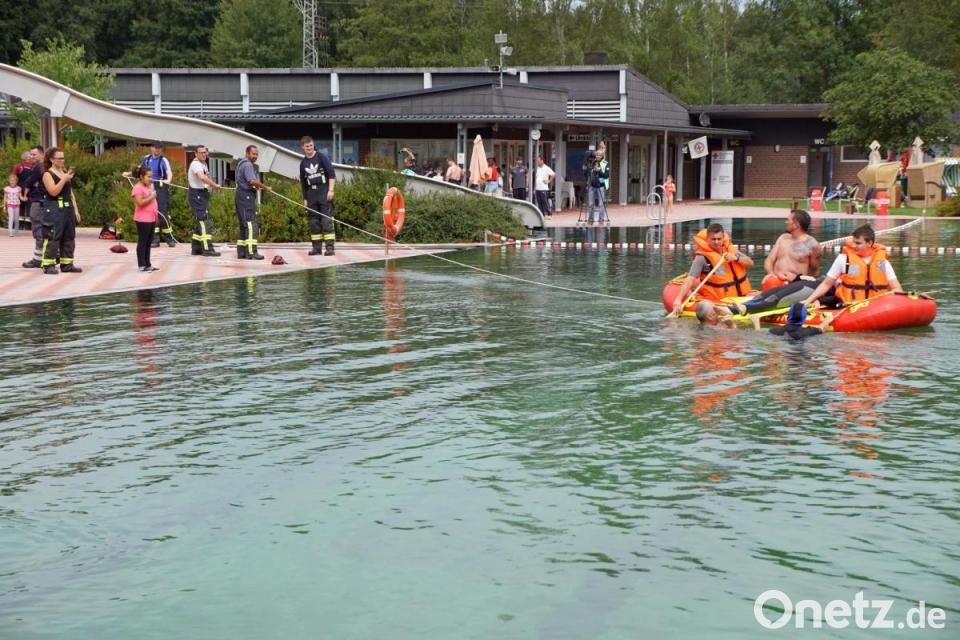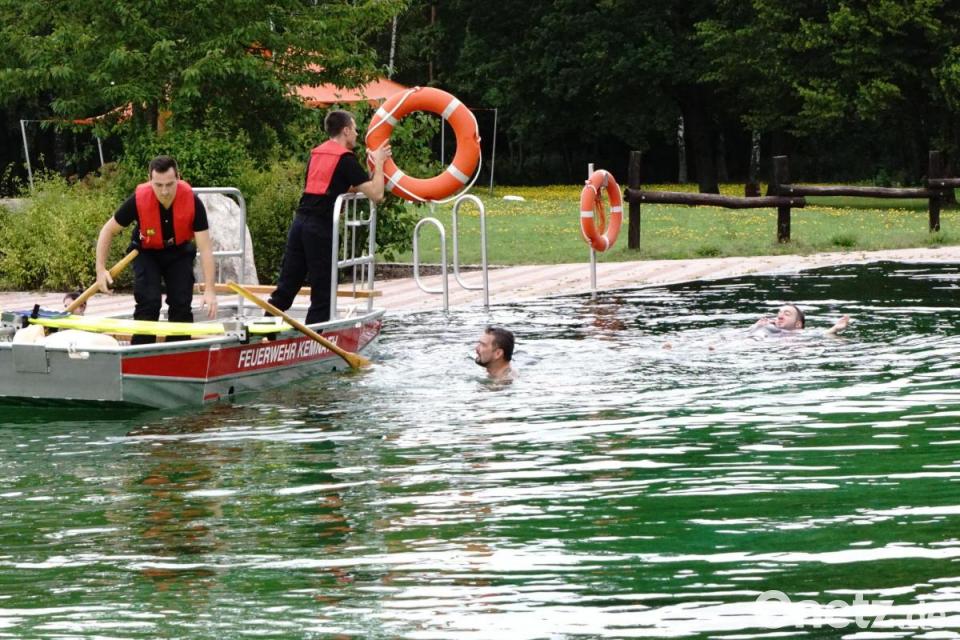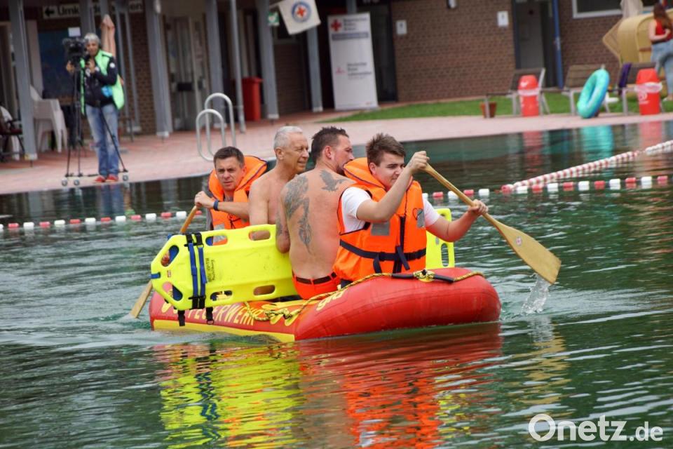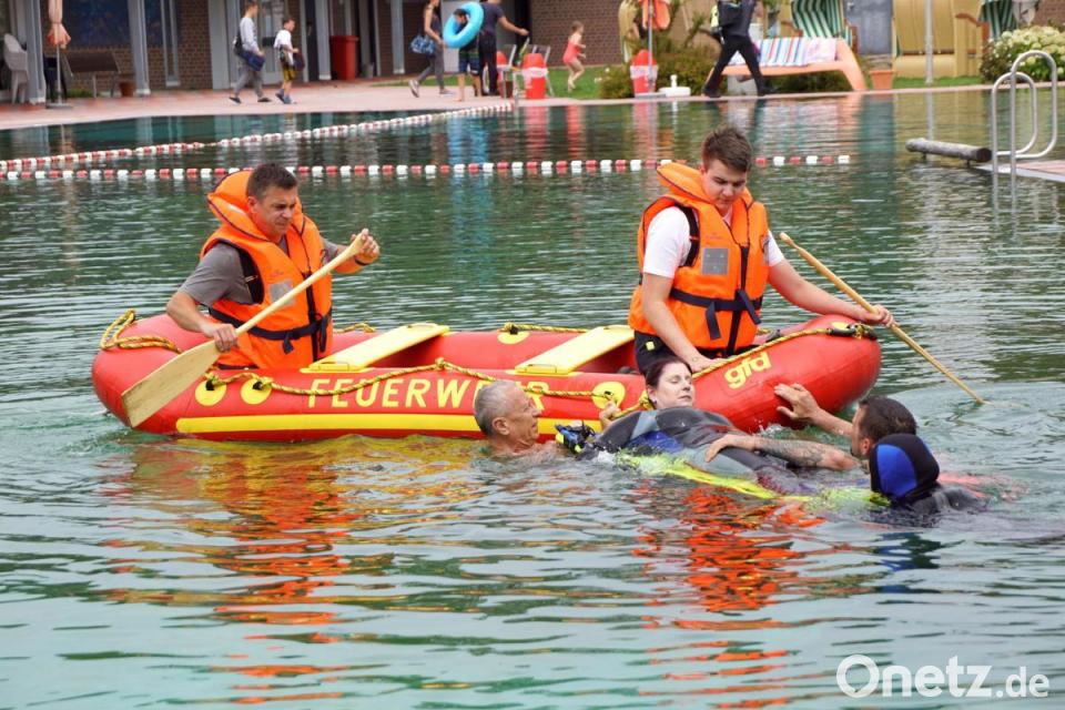 Ernst wurde es dann nach der Mittagspause. Die Feuerwehren stellten vor der Übung im Becken ihre Boote und deren Einsatzmöglichkeiten vor. Geübt wurde nicht nur, so schnell wie möglich Menschen aus dem Wasser zu retten; die 41 Teilnehmer probten zugleich die Reanimation auf dem Boot.