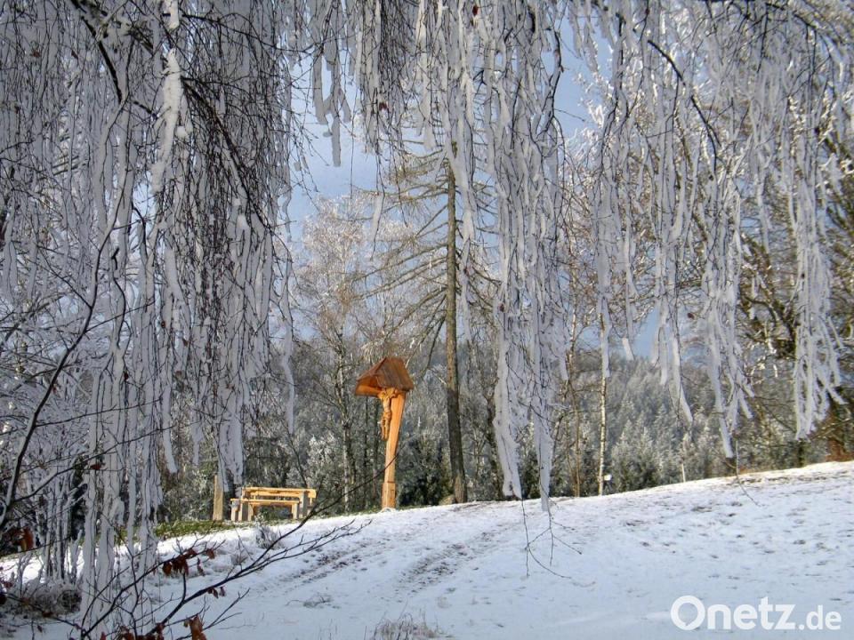 Das Zausenkreuz auf dem Poppenberg wurde im vergangenen Jahr erneuert. Es ist vermutlich das dritte Feldkreuz mit einer Höhe von 3,40 Metern. Die Geschichte des Feldkreuzes soll 500 Jahre zurückreichen. 1987 warf ein Sturm das 4,60 Meter große alte Feldkreuz um. In unmittelbarer Nähe des bisherigen Standortes wurde das neue Kreuz, ergänzt durch eine Sitzgruppe, am Wanderweg zur Tauritzmühle aufgestellt. „Setz di nieda“ heißt die in die Lehne der Bank geschnitzte Einladung. Eine Laterne auf einer alten Gartensäule aus Granit ergänzt die zum Innehalten auffordernde Gruppe. Die Raureiftage des alten Jahres gaben dem neuen Ort ein winterliches Aussehen. Einer privaten Initiative ist es zu verdanken, dass die Geschichte des Kreuzes am Leben erhalten bleibt. Wanderer oder alle, die sich eine Ruhepause auf dem neu geschaffenen Platz gönnen, werden von der neuen Sitzgruppe aus mit einem Blick in die Frankenpfalz belohnt.