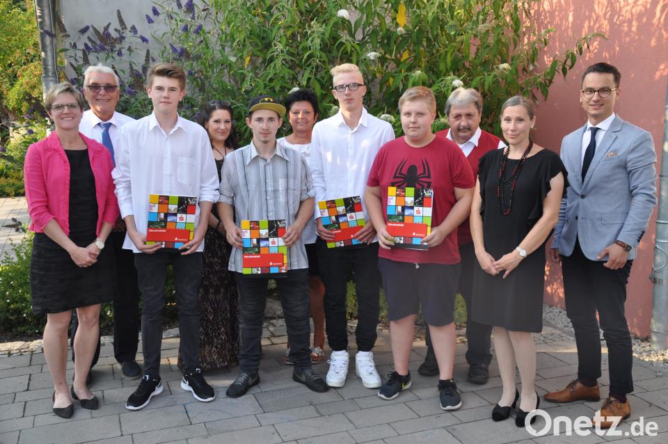 Stellvertretende Schulleiterin Stefanie Lauter-Seitz (von links), zweiter Bürgermeister Josef Hecht, Martin Panzer, Fachlehrerin Melanie Iadonisi, Dominik Baisi, Förderlehrerin Brigitte Koch, Pascal Goller, Abschlussbester Sebastian Scheidler, Schulleiter Wolfgang Schmidt, Klassenlehrerin Silke Nußstein und Kreisrat Bernhard Söllner.