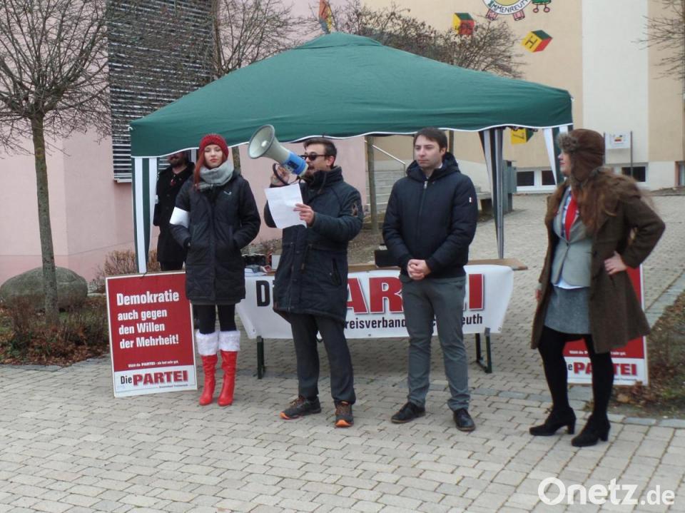 Die Onlinesuche nach einem Bürgermeisterkandidaten der SPD Immenreuth hat "Die Partei", Kreisverband Tirschenreuth, mit Konstantin Kühnelt aus Kemnath an der Spitze, auf den Plan gerufen, eine Kandidatensuche per Losentscheid umzusetzen. Zu dieser Aktion wurde neben dem Rathaus ein Pavillon aufgestellt, Marco Kellner aus Ebnath war Moderator der Kandidatenauslosung. Rund ein Dutzend Bürger hatte sich wohl mehr aus Neugierde eingefunden und bekam vom Moderator übers Megafon zu hören: "Wenn die Bürger nicht zur Demokratie kommen, kommt die Demokratie zu ihnen."