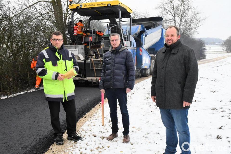 Hirschaus Bürgermeister Hermann Falk und der Dritte Bürgermeister der Gemeinde Freudenberg, Christian Drexler, informierten sich am Dienstag bei einem Ortstermin mit Stefan Noll, dem zuständigen Abteilungsleiter beim Staatlichen Bauamt Amberg-Sulzbach, bei laufenden Asphaltierungsarbeiten über den Baufortschritt. Die beiden Bürgermeister sehen eine Bereicherung für ihre Kommunen durch die hohe finanzielle Förderung des Projekts durch den Freistaat. Die Kosten des diesjährigen Radwege-Bauabschnitts belaufen sich auf rund 200.000 Euro. Sie werden zu wesentlichen Teilen (87,5 Prozent) vom Freistaat Bayern (Baulastträger der Staatsstraße 2238) und den betroffenen Kommunen, der Stadt Hirschau (Länge 0,4 km) und der Gemeinde Freudenberg (Länge 0,6 km) getragen. Die Bauarbeiten zwischen Immenstetten und Steiningloh sollen in Abhängigkeit von den Witterungsverhältnissen im Frühjahr 2022 durch das Auftragen der finalen Feinschicht und damit rechtzeitig zur neuen Radfahrsaison abgeschlossen werden.