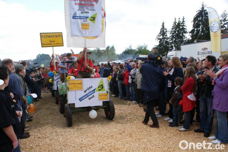Knetzgaus Bürgermeister Stefan Paulus stieg zu Bürgermeister Hammer, Gabi Müller und Günther Wolfrum auf den Wagen, Fritz Kick fuhr den Bulldog und Bruder Bernhard saß als Fahnenträger vorne drauf. Von der Polizei eskortiert führte der Zug zum Festplatz, auf den man unter tosendem Applaus durch das Spalier von mehreren tausend Besuchern einzog. Bürgermeister Hammer erklärte auf der Bühne, dass er und seine Bürger die eigentlichen Sieger seien: Denn Irchenrieth könne feiern, während die Knetzgauer arbeiten müssten.