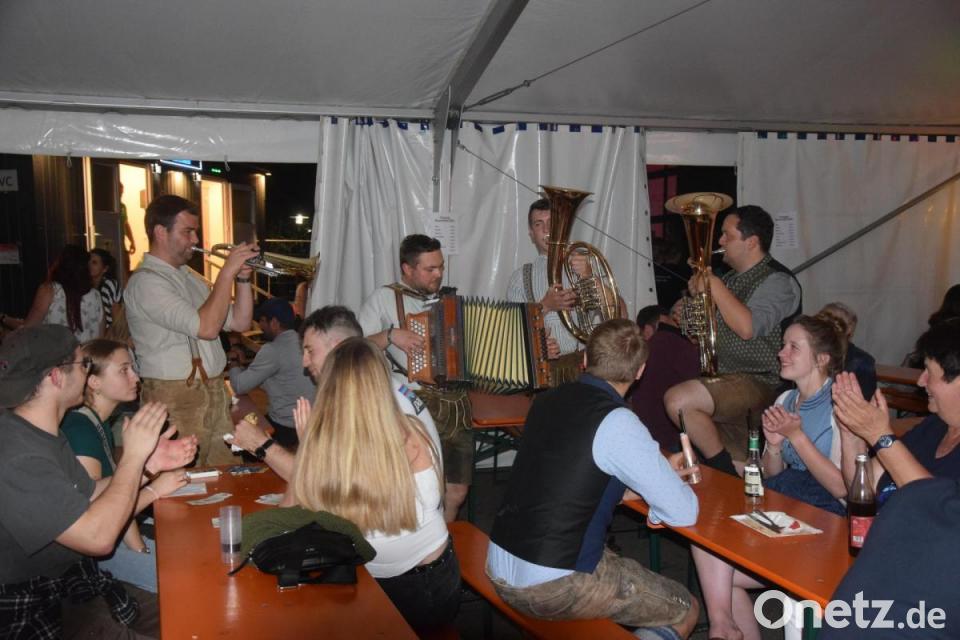 Der erstmalige Aufbau einer Weinlaube kam ebenfalls gut an. Viele zogen einen kühlen Schoppen dem Seidl Bier vor. Abends dann Kirwamusik mit den Hulzstoussboum. Jonas, Andreas, Julian und Konstantin mit Steirischer, Trompete, Posaune und Horn spielten ohne Playback und Elektrotechnik zünftig bayrisch-böhmisch auf, wobei sich Kirwastimmung dann auch breit machte, als sie von der Bühne stiegen, sich zwischen die Gäste mischten und die zum Mitklatschen und Mitsingen animierten.