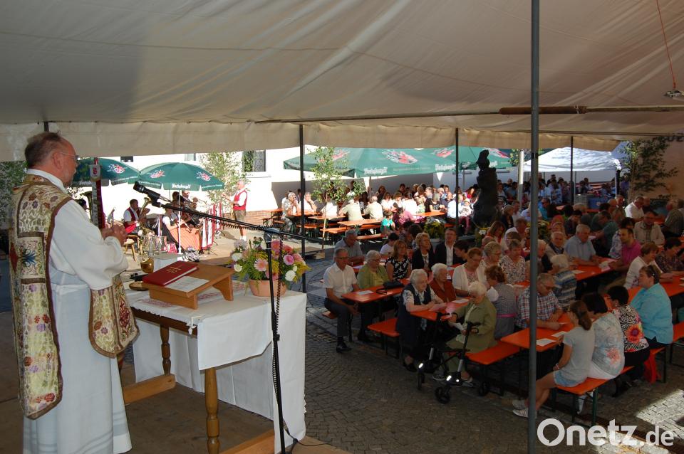(grm) Seit 1988 wird das Kirchweihfest nun offiziell in Verbindung auch mit dem Brunnenfest der Feuerwehr am zweiten Sonntag im August gefeiert. So zogen am Sonntag die Vereine der Pfarrei mit Fahnen und der Gleiritscher Blaskapelle zur überdachten Freifläche zwischen Kirche und Feuerwehrhaus. Dort zelebrierte Pfarrer Alfons Forster a m Floriansbrunnen den Festgottesdienst mit zahlreichen Gläubigen.