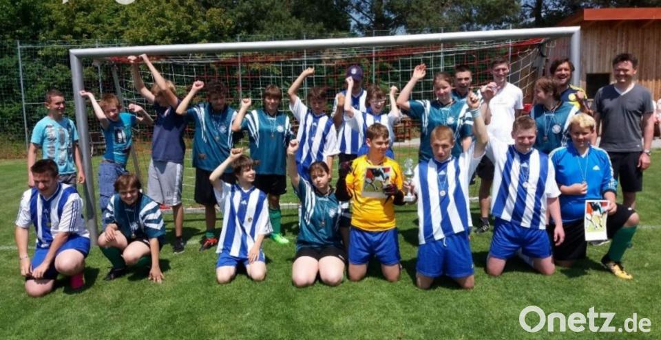 Begeistert und ausgelassen feierten die Fußballer/innen beim Bezirksturnier der Förderschulen mit dem Förderschwerpunkt geistige Entwicklung ihre Siege und freuten sich über Medaillen und Wanderpokal. Unsere Aufnahme zeigt in der hinteren Reihe von rechts Turnierleiter und Trainer Markus Schuller, Betreuer des HPZ-Teams und Schiedsrichter Christian Steinlein und Schiedsrichter Thomas Malzer.