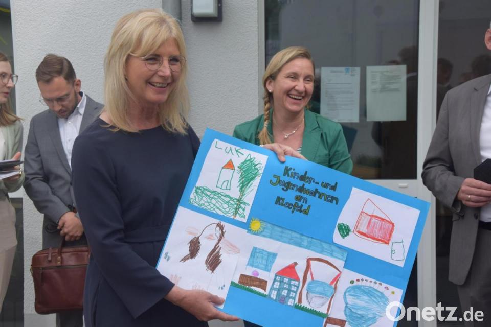 Stadler sprach von 6,3 Millionen Euro Kosten für das Projekt. Man habe auch sehr viele Spenden erhalten. Einweihung wird am 15. Juli sein. Die Leiterin dieser Einrichtung, Stephanie Filchner, stellte der Ministerin das Konzept mit den 24 Plätzen vor. Es gebe drei Wohnformen: eine offene, die halboffene und die geschlossene Gruppe. Die Kinder- und Jugendlichen im Alter von 3 bis 20 Jahren seien tagsüber in der Schule und kämen danach in ihre Wohngruppe. Filchner informierte die Ministerin auf Nachfrage, dass die Kinder aus der Region kommen, aber dass es Unterbringungsanfragen aus ganz Deutschland gebe. Der Kontakt zu den Eltern sei unterschiedlich. Einige holten ihre Kinder am Wochenende oder in den Ferien nach Hause, aber es gebe auch Fälle, wo sich die Eltern nicht kümmerten.