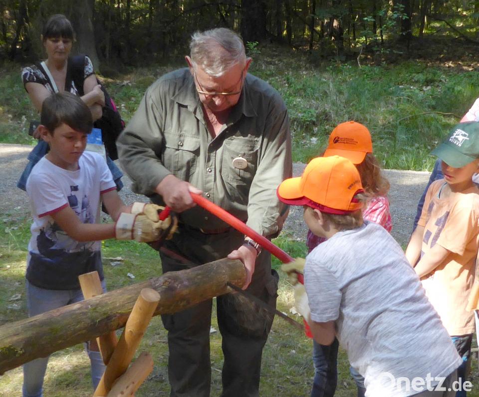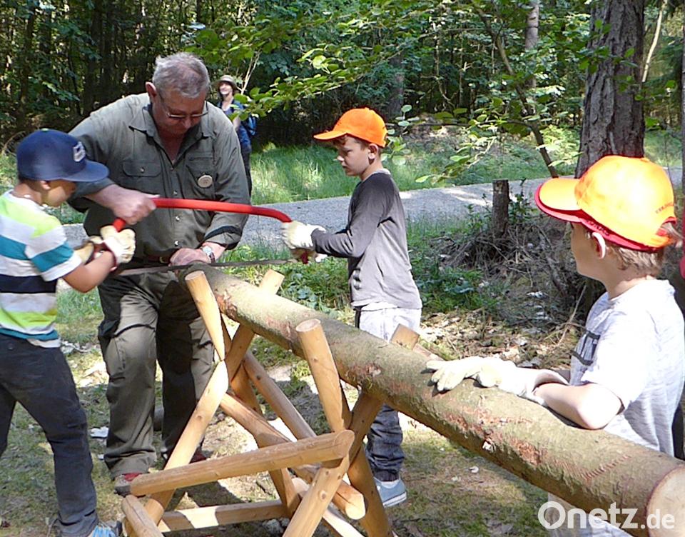 So galt es, vier Tiertafeln abseits des Weges zu entdecken und Fragen zu verschiedenen Themen zu beantworten: Sie betrafen beispielsweise den Baum und den Vogel des Jahres, die "nachhaltige Leistung der Wälder" und den Naturschutz. An drei Spielstationen war eine Kombination aus Wissensfragen "am Objekt" mit Geschicklichkeit, Schnelligkeit und Ausdauer gefordert. Beim "pfundigen Sägespiel" schätzten die Kinder, wie groß eine 500-Gramm-Scheibe trockenes und nasses Holzes ist und sägten sie dann ab.