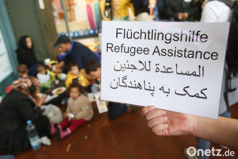 Ein freiwilliger Helfer hält am 13.09.2015 im Hauptbahnhof in Hamburg ein Schild auf deutsch, englisch und arabisch, auf der Hilfe für Flüchtlinge angeboten wird. Im Hintergrund ist eine Flüchtlingsfamilie zu sehen, die im Hauptbahnhof von freiwilligen Helfern versorgt wird.