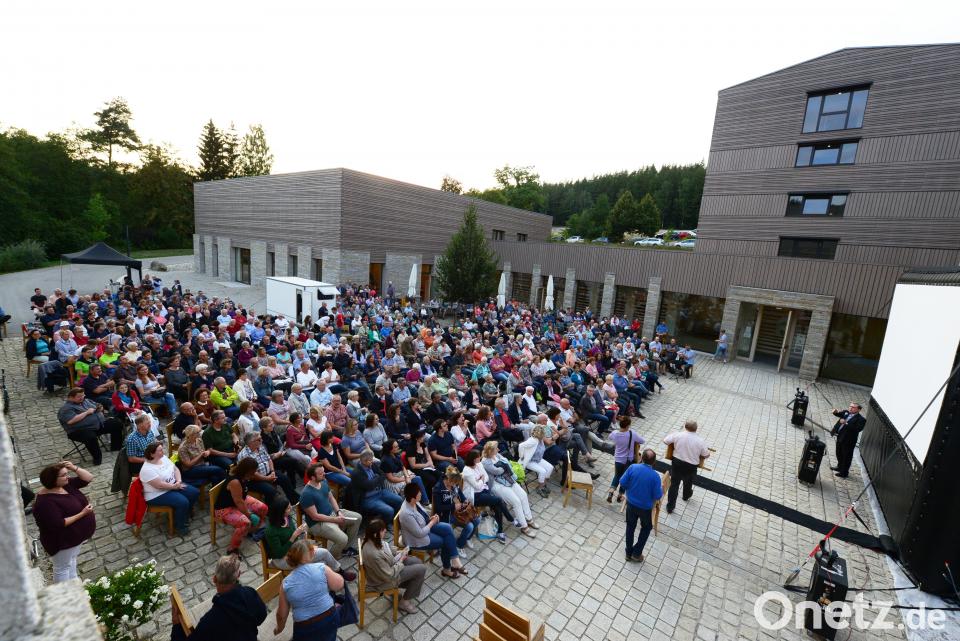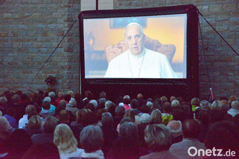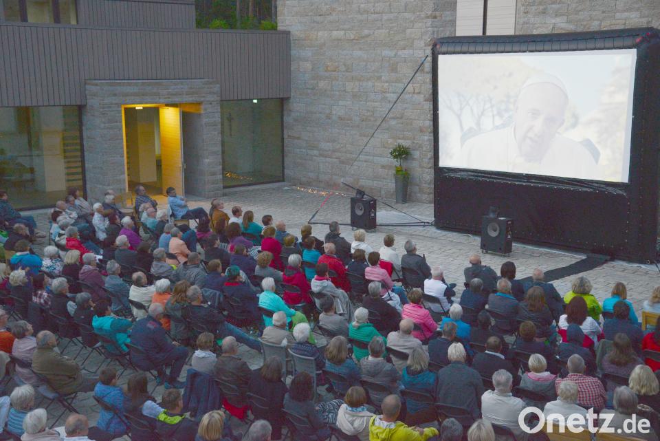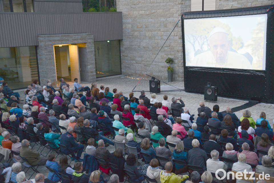 (bey) Für 200 Besucher waren zunächst vor der großen Leinwand Stühle aufgestellt worden. Letztlich kamen rund 450 Besucher. Zusätzliche Sitzgelegenheiten wurden aus dem Speisesaal auf den Vorplatz geschleppt. Direktor Manfred Strigl bat die Besucher, angesichts des für die Filmvorführung noch zu hellen Abends erst einmal die kulinarischen Angebote der Exerzitienhaus-Küche zu verkosten. Den Preis dafür durften die Gäste selbst festlegen. Strigl dankte Evelin Polland, deren Idee und Initiative das Open Air zu verdanken sei, und schlug vor, die Stühle ganz im Sinne des Papstes zu teilen. Als es dunkel genug war, hieß es „Film ab“, gleichzeitig wurde es mucksmäuschenstill auf dem Platz.