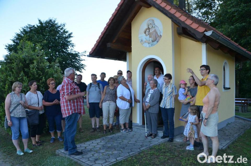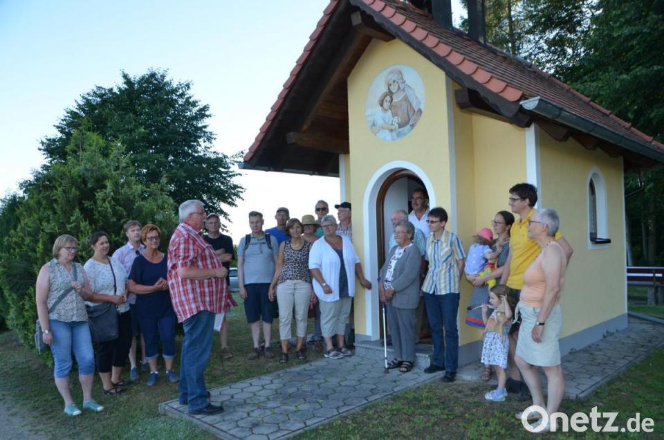 1919 errichtete Franz Faltenbacher ein Holzkreuz, weil sein Sohn aus dem Ersten Weltkrieg gesund heimkehrte. Dieses Kreuz wurde 31 Jahre später durch das jetzige Feldkreuz ersetzt, berichtete Großmann. Faltenbacher ist sehr betrübt, weil durch die Flurbereinigung die Standfläche des Feldkreuzes der Stadtgemeinde Vohenstrauß zugeteilt wurde. „Der Platz verkam dann zusehends und beim Bau der Schönbergerkapelle wurde das Areal in den heutigen Zustand versetzt. Fritz Schönberger der Erbauer der Kapelle und unvergessener Porzellanmaler, renovierte das Kreuz immer wieder. Nach gut eineinhalbstündiger Wanderung durch die Natur von Kaimling und lauschigen Temperaturen kam die Gruppe schließlich an der Schönbergerkapelle an. Die Ehefrau des verstorbenen Kapellenerbauers Therese Schönberger wartete dort bereits auf die Besuchergruppe und öffnete das schmucke Juwel, damit die Sommerhitze entweichen konnte.