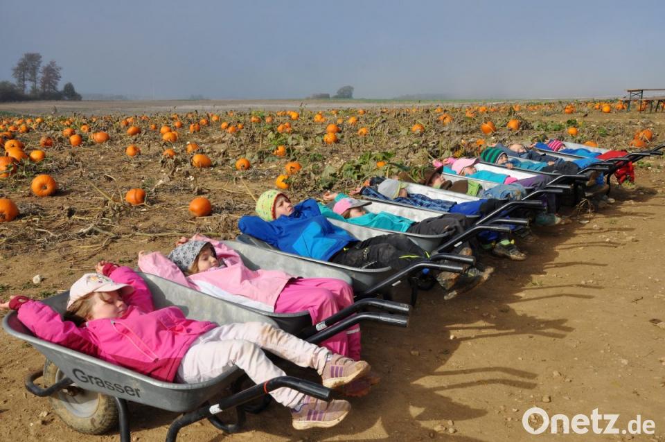 Der Besitzer eines großen Kürbisfelds in der Nähe von Litzlohe (Landkreis Neumarkt) hatte die Vorschulkinder vom BRK-Waldkindergarten Räuberwald eingeladen, sich auf seinem Grund ihre eigenen Kürbisse auszusuchen. Die Familie Grasser aus Amerika sät auf einer Fläche von eineinhalb Hektar jedes Jahr ein ganzes Kürbisfeld an.