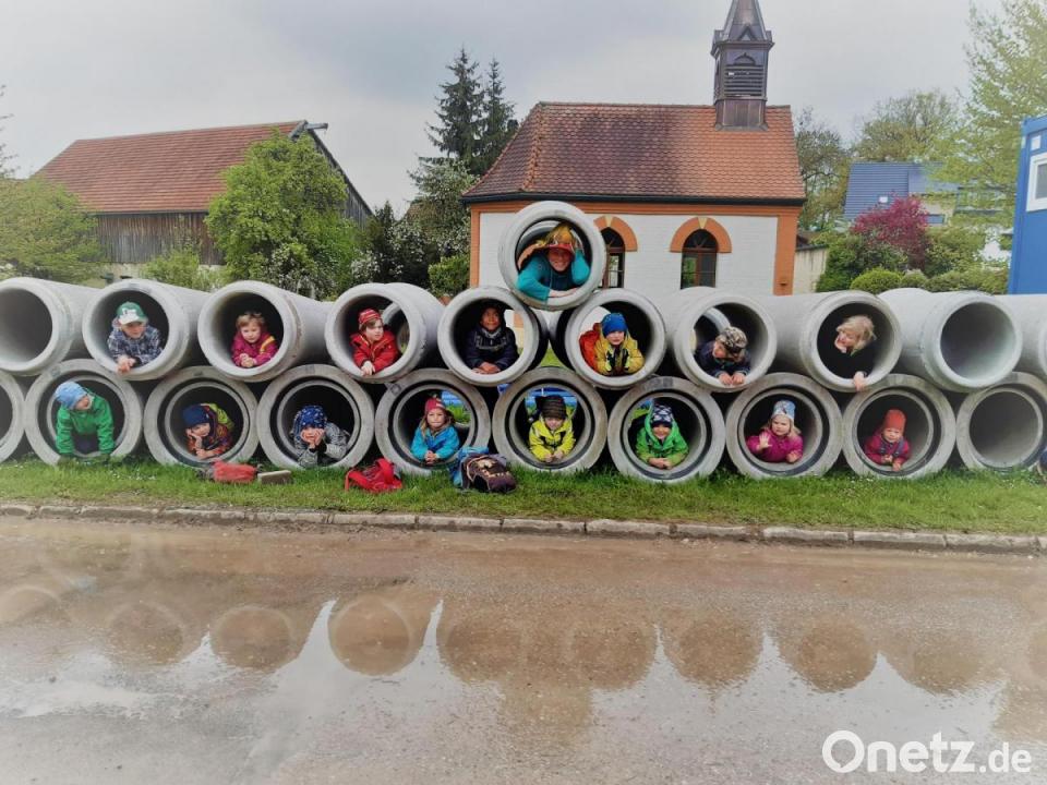 Die Dorferneuerung in Kainsricht ist seit einigen Wochen voll im Gange. Ganz zur Freude der Mädchen und Buben aus dem Waldkindergarten Räuberwald. Die bahnen sich täglich einen neuen Weg durch die Großbaustelle. Dabei begegnen ihnen interessante Fahrzeuge, die sie mit großer Begeisterung bestaunen. Sie rufen in die Kanalrohre hinein, um die die Echos zu hören, und verstecken sich darin.
