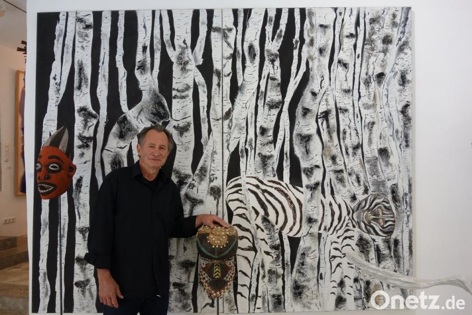 Dahinter steckt Wigg Bäuml. Selbst einer von ihnen, hat er den Oberpfälzern mit dem Gemälde einen augenzwinkernden Spiegel vorgehalten. Schon zu Beginn seiner Karriere thematisierte der Kallmünzer Künstler die Spannbreite zwischen Selbstwahrnehmung und Erscheinungsbild, zwischen Heimat und vermeintlich Fremdem. Genau da knüpft Wigg Bäuml mit seiner aktuellen Ausstellung an. Im "Kunstraum Wigg" im Bertholzhofener Schlösschen in Kallmünz vereint er derzeit zwei unterschiedliche Stränge, die zusammen bestens funktionieren: Eigene Werke sowie afrikanische Kunst schlagen eine Brücke zwischen der Oberpfalz und dem Schwarzen Kontinent.