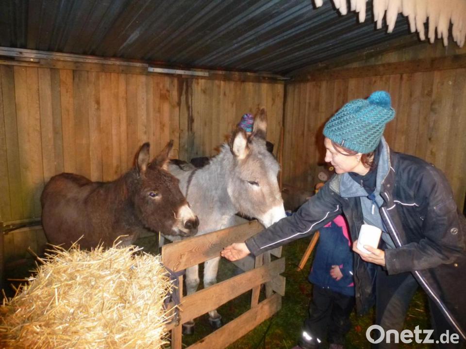 Jutta Prößl aus Hütten hatte mit ihren Eseln Molli und Charly den Weg von Hütten und zurück auf sich genommen. Im Stall waren sie begehrte Streichelobjekte für die Kinder. Der Posaunenchor unter Katrin Seidl spielte zur Einstimmung und begleitete auch das lustige Krippenspiel.