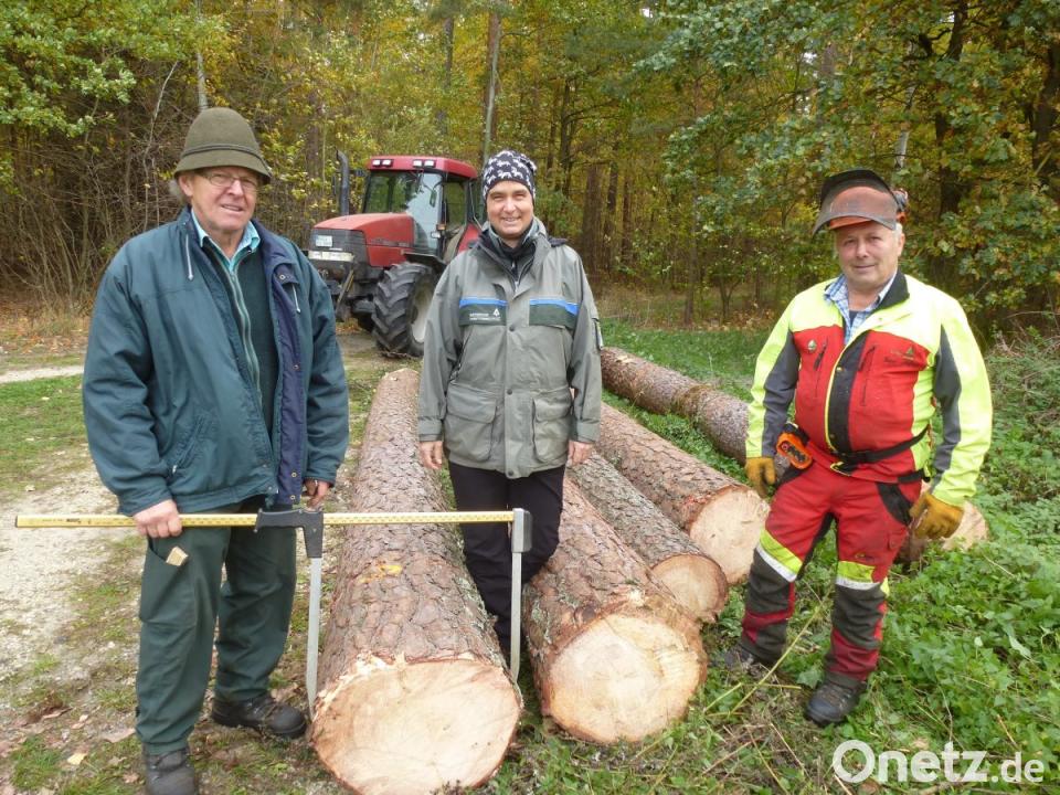 "Das forstwirtschaftliche Jahr war geprägt von Borkenkäfer, Trockenheit und Windwurf. Deshalb freut es mich besonders, dass wir ein positives Erlebnis vorweisen", betonte Forstamtsrätin Andrea Sauer (Mitte) am Dienstag nach dem Einschlag von sechs Prachtexemplaren im Gemeindewald durch Forstwirt Helmut Prechtl (rechts). "Die Bäume sind sehr alt und langsam gewachsen. Sie haben einen engen, feinen und gleichmäßigen Jahrringbau und sind frei von Buchs, Beulen und Ästen. Das Holz wird für den Instrumenten- und Fensterbau verwendet", erklärte die Revierleiterin. Georg Forster (links), Holzwart der Forstbetriebsgemeinschaft Neustadt/WN-Süd, organisiert seit 17 Jahren Holz für die Submission: "Zwei Lkw mit Kiefern und Lärchen bringen wir zur Wertholzversteigerung nach Himmelkron. Die exklusiven Filetstücke würden einzeln verkauft, bemerkte Sauer.