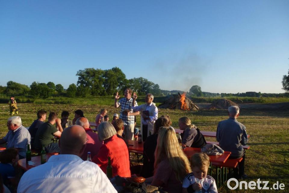 Die Sonnwendfeier der Marktfeuerwehr war am Samstagabend wieder ein Anziehungspunkt für viele Eltern mit ihren Kindern. Sie wurden zunächst im Unterrichtsraum des Gerätehauses von Jugendwart Alexander Fischer mit einem Notruftraining beschäftigt. „Das war toll“ meinte beispielsweise die achtjährige Marie. Pfarrer Matthias Weih trug die Lesung aus dem 1. Petrusbrief vor. Der Glaube soll sich bewähren wie Gold im Feuer, hieß es zur Einführung. Vizekommandant Tobias Ludwig hatte den großen Holzstoß auf brandsicherem Gelände fachgerecht entzündet, ehe Pfarrer Varghese Puthenchira das Feuer segnete. Nach dem gemeinsam