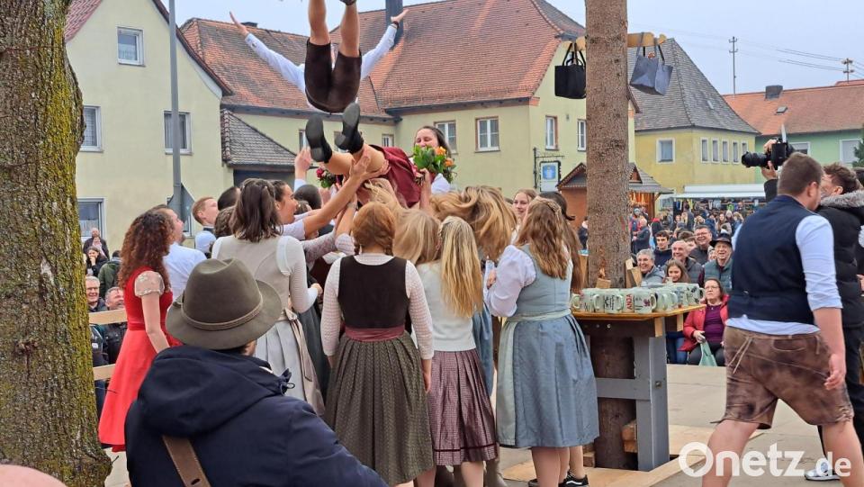 Der Oberkirwabursch wurde von seinen Kameraden gleich mehrmals in die Luft geworfen, ehe er trotz angeschlagener Stimme Kirwasprüche losließ. Großer Jubel brach aus. „Wer hat die beste Tanzlehrerin?“ riefen die Kirwapaare, als Alexandra ein Blumenstrauß überreicht wurde und sie darauf alle einzeln umarmte. Nach dem Ehrentanz des Oberkirwapaars zog man ins evangelische Gemeindehaus, das sich angesichts des Kuchenbüfetts rasch mit Gästen füllte. Heiß begehrt waren die von Pfarrer Weih selbst gebackenen fränkischen Kirwakücheln. Gemütlich klang der Abend aus.