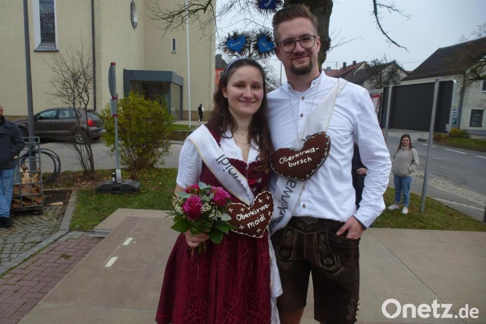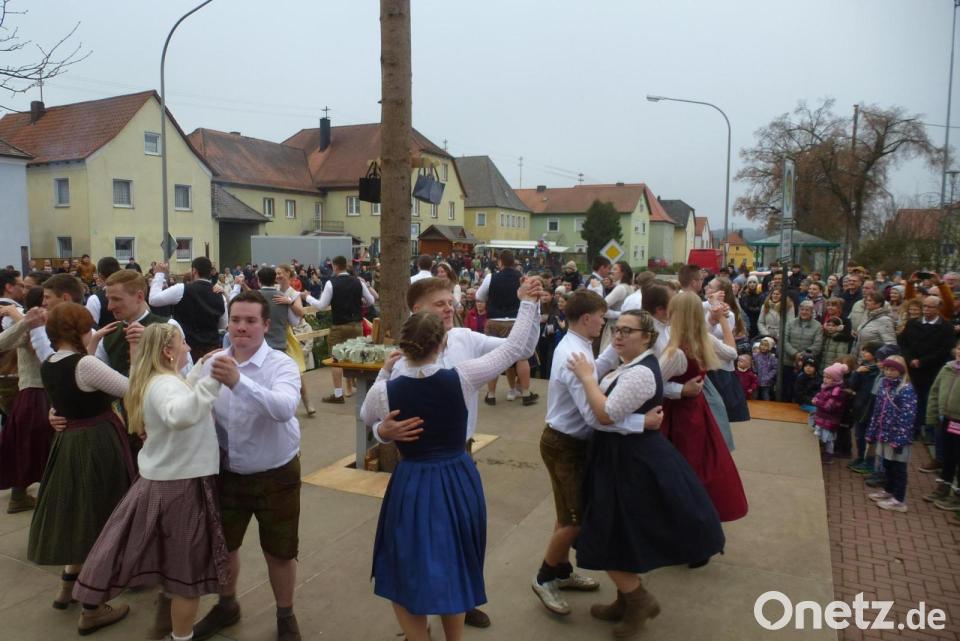 Rund 700 Zuschauer, unter ihnen die drei Geistlichen und zweiter Bürgermeister Julian Kraus, hatten sich im weiten Rund des Marktplatzes eingefunden, als die 18 Tanzpaare nach der Generalprobe in der Stockhalle hoch auf dem mit Sonnenblumen geschmückten, von Matthias Köstler per Traktor gezogenen Wagen mit „D'Hohlweglauerer“ und „Wer hat Kirwa“ und „Drei Tage gehen wir nicht mehr heim“-Rufen auf die Bühne einmarschierten. Was Alexandra Bocka, mit Ehemann selbst unter den 18 Paaren, fleißig eingeübt hatte, zeigten diese bei Sternpolka, Figurentanz und Ochsentreiber. „Jetzt trinken wir mal, der Rausch lässt nach“ erschallte in den Pausen. Als die Musiker beim Walzer „In der Oberpfalz steht ein Bauernhaus“ anhielten, landete der Blumenstrauß bei Simon Braun und Laura – genannt Lilly - Witzel.