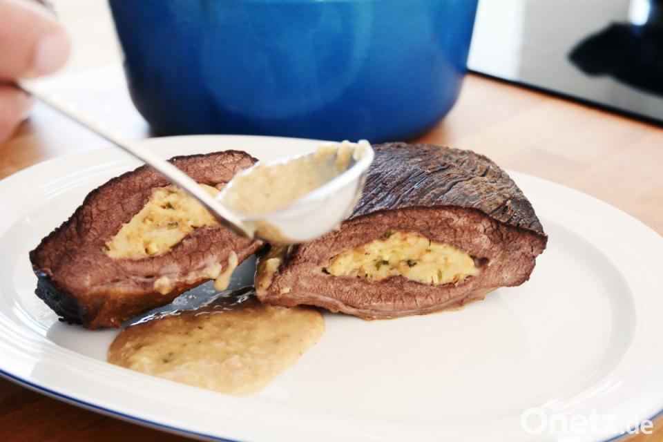 Für die Füllung die Semmeln in heißer Milch einweichen, etwas ausdrücken und in eine Schüssel geben. Zwiebeln schälen und würfeln. Fett in einem Topf erhitzen und die Zwiebeln darin glasig dünsten. Die Semmelmasse hineingeben und so lange auf kleiner Flamme rühren, bis sich die Masse vom Topf löst. Nach dem Abkühlen mit Ei, Kräutern und Gewürzen vermengen und abschmecken. Das Fleisch damit füllen und zunähen. In einer Kasserolle Butter erhitzen und das Fleisch darin anbraten. Mit drei Tassen Wasser begießen und im Backofen bei mittlerer Hitze 100 bis 120 Minuten garen. Die Speisestärke mit Sahne verrühren und die Sauce damit abziehen. Mit Petersilie verfeinern und abschmecken. Dazu passen Salzkartoffeln und Gemüse oder grüner Salat. Kalbsbrust mit Semmelfüllung schmeckt auch kalt und aufgeschnitten ausgezeichnet. (mip)