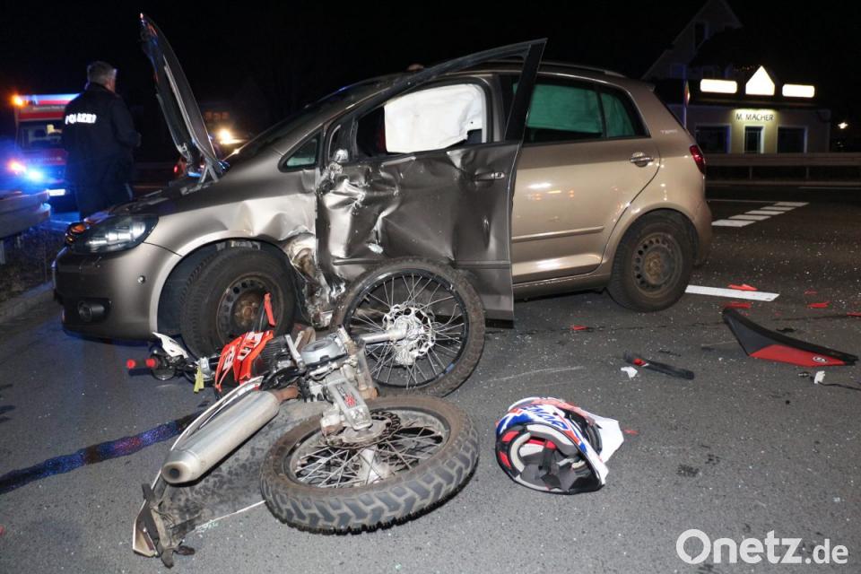 Ein 58-Jähriger wollte mit seinem Golf die Staatsstraße von der Ortsmitte kommend in Richtung Industriestraße überqueren. Der Weidener übersah dabei zwei Jugendliche aus dem Gemeindebereich Trabitz, die zur gleichen Zeit auf der Staatsstraße 2665 mit einer Motocross-Maschine von Pressath in Richtung Kemnath unterwegs waren. Im Kreuzungsbereich kam es zum folgenschweren Unfall. Die Enduro kollidierte auf Höhe der Fahrertür mit dem Golf. Dabei zog sich der 17-jährige Fahrer schwere Verletzungen zu. Der Rettungshubschrauber flog ihn in ein Krankenhaus nach Bayreuth. Mit mittelschweren Verletzungen brachte ein Rettungswagen seinen 16-jährigen Sozius ins Weidener Klinikum. Der Golf-Fahrer blieb unverletzt, war aber vom Geschehen sichtlich mitgenommen. An beiden Fahrzeugen entstand ein Schaden von insgesamt rund 20 000 Euro.