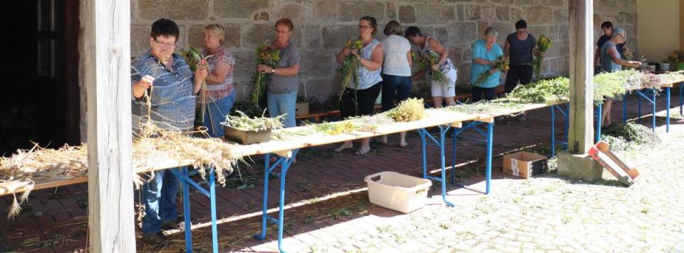 Die Bevölkerung kann sich in Kastl auf „ihren“ Katholischen Frauenbund verlassen: Vorstand und Mitglieder banden wieder zahlreiche Kräuterbuschen für den Festgottesdienst zu Ehren der Heiligen Mutter Gottes. 16 Frauen stellten unermüdlich in einer langen Reihe einen Strauß nach dem anderen zusammen. Die Kräuter und Blumen spendeten Kastler Bürgerinnen und Mitglieder des Frauenbundes. Nach getaner Arbeit genossen die Damen Kaffee und Kuchen im Freien unter dem prächtigen Lindenbaum.