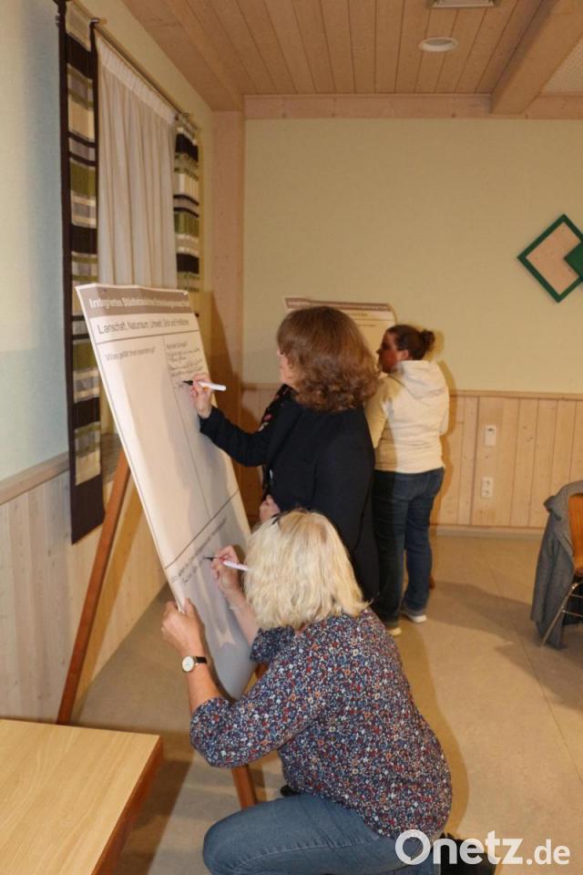 Die Bürger konnten anschließend Flipcharts zu den verschiedenen Themenbereichen nützen, um ihre Wünsche und Gedanken einzubringen. In den ausgelegten Ortsplan wurde eine Überquerungsmöglichkeit der Haidenaab zwischen Unterbrucker Flur und Kastl eingezeichnet. Andere möchten den Dorfweiher wieder entstehen lassen. Schattenspendende Bäume entlang der Spazierwege, gerne Obst- und Nussbäume, wurden vorgeschlagen, wie auch ein grüner Baumgürtel rund um den Ort zur Kühlung im Sommer, zur Verbesserung des Kleinklimas sowie als Beitrag zur Klimarettung.