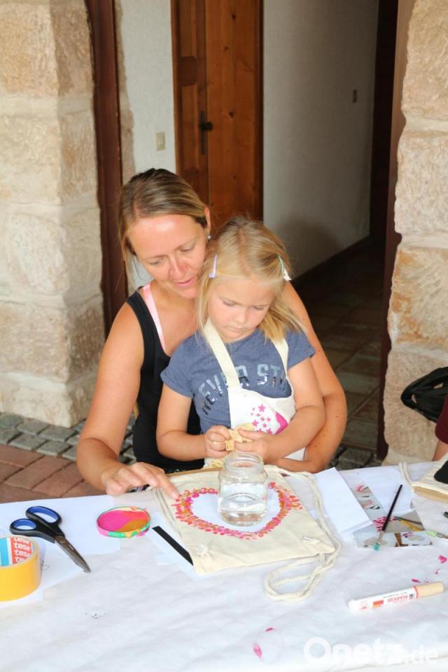 Mit verschiedenen Stoffmalfarben durften auf eine Umhängetasche eigene Bildideen aufgebracht werden. Richtige kleine Künstler befanden sich unter den Kindern. Man sah Herzchen, mit dem Finger getupft, aber auch mit dem Pinsel aufgemalte Motive aus "Harry Potter", zum Beispiel das Zeichen für die drei Heiligtümer des Todes.