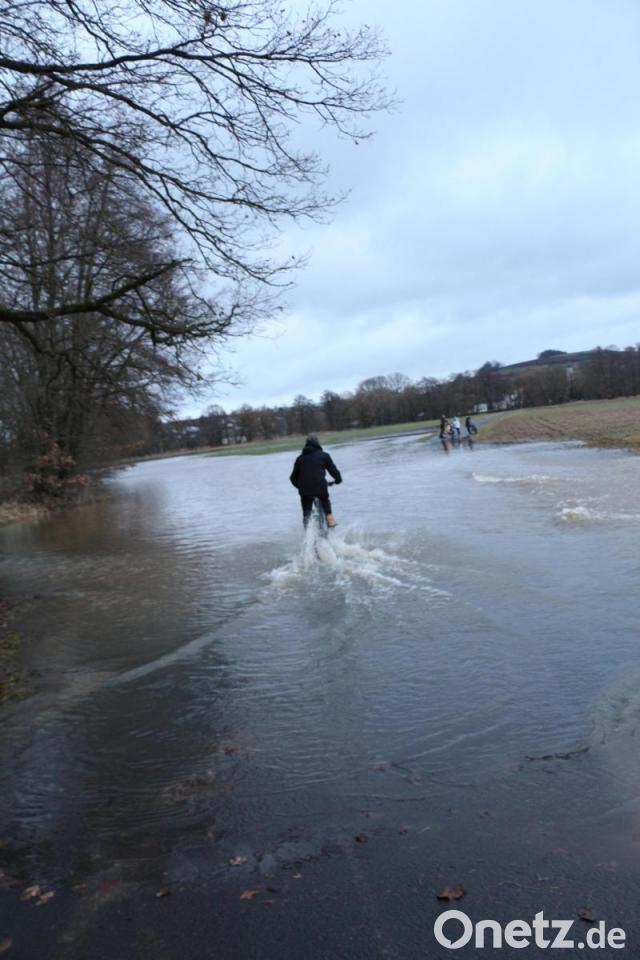 In Unterbruck zeigte die Skala an der Brücke am Dienstagabend einen Wasserstand von 1,90 Meter an. Bäume, die sonst am Rand des Gewässers auf der Höhe der umliegenden Wiesen wachsen, standen inmitten der Fluten. Es fehlte auch hier nicht mehr viel, bis das Wasser den Kinderspielplatz erreicht hätte.