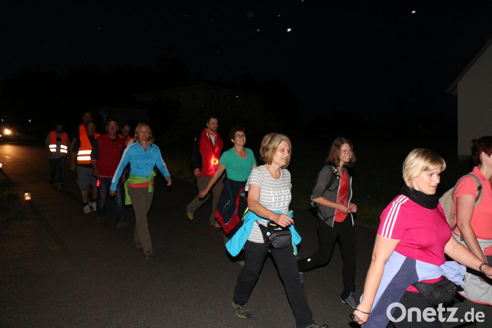 Festen Schrittes zogen die Pilger dann hinaus in die Nacht. Die Anwohner hatten mit Windlichtern wieder den Weg gesäumt und sich so von den Freunden und Bekannten verabschiedet. Mit dem Lied "Großer Gott, wir loben dich", Gebeten und Liedern im Wechsel führte sie Frieda Zeitler dem 54 Kilometer entfernten Ziel entgegen.
