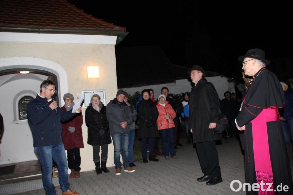 Nach der Andacht segnete Voderholzer den renovierten Kirchturm und schaltete dessen neue Beleuchtung ein. „Unser Kirchturm schaut ja aus wie eine umgedrehte Schultüte“, zitierte Tragswerksplaner Konrad Kraus in seiner Ansprache Kirchenpfleger Anton Gebert, und fügte hinzu: „Das sollte sich durch die Renovierung ändern.“ Kraus informierte über den Bauablauf. Er wies auf die neu eingebauten Spitzgiebeln, das renovierte Turmkreuz, die renovierten Uhr und die frisch vergoldete Turmkugel hin. Im Anschluss lud Pfarrgemeinderatssprecher Willibald Wiedenbauer zum Stehempfang in den Pfarrgarten am Fuße des Kirchturms ein.