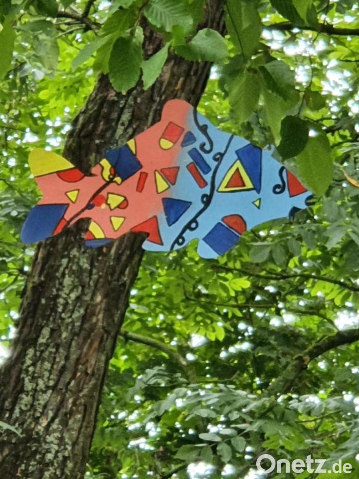 Rechtzeitig zur Eröffnung der Fischwochen am Wochenende hat Susanne Vonhoff jetzt mit Hilfe des Kemnather Bauhofs diese bunten Metallkarpfen in den Bäumen entlang des Phantastischen Karpfenwegs aufgehängt. Die Kinder, die die bunten Metallkarpfen in der Schule und im Atelier an der Stadtmauer gemalt haben, können jetzt ihre fliegenden Fische in den Bäumen entdecken. Aber auch die Wanderer werden ihre Freude daran haben.