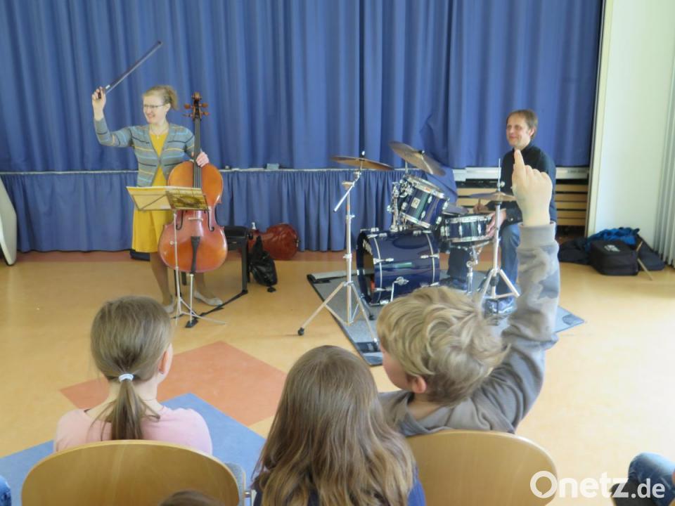 Kinga Schröder zeigte den Schülern der vier Klassen, wie Cello gespielt wird. Dazu hatte sie auch ein Kinder-Cello mitgebracht.