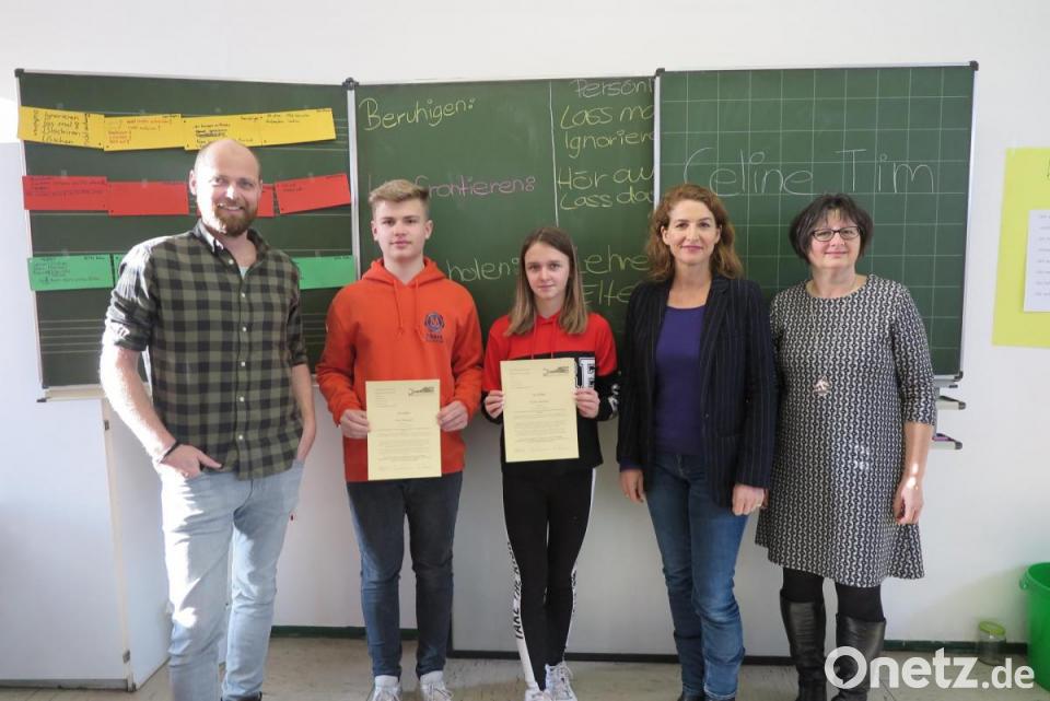 Drei Doppelstunden haben sie erfolgreich in der fünften Klasse gehalten. Jugendsozialarbeiterin Carola Reger hatte die zwei Schüler während der Ausbildung und bei der Vorbereitung des Projekts begleitet